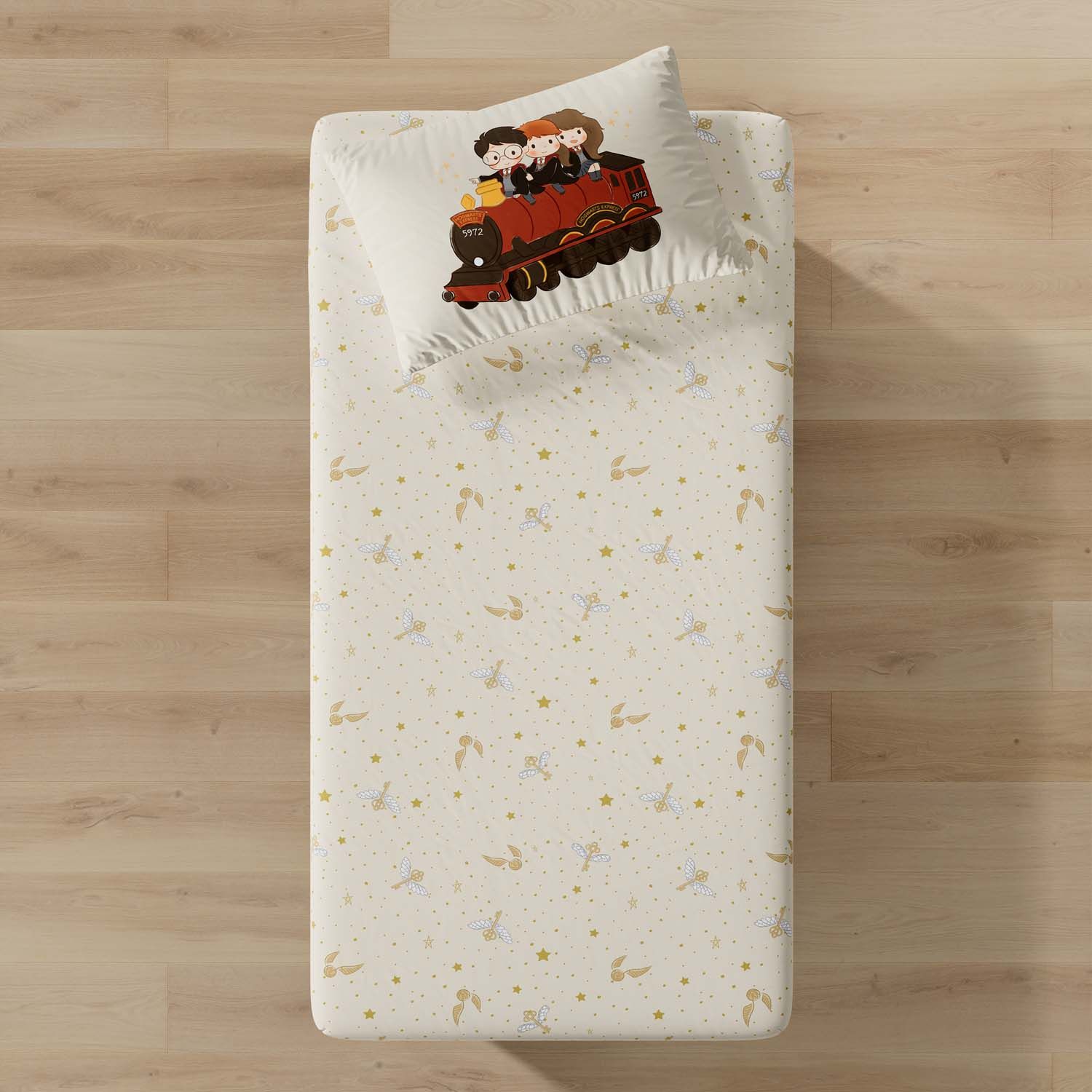 Com estampas inspiradas nos queridos personagens de Harry Potter, o jogo de lençol vem com duas peças: lençol de baixo com elástico estampado e fronha com estampa do Harry Potter e sua corujinha Edwiges.