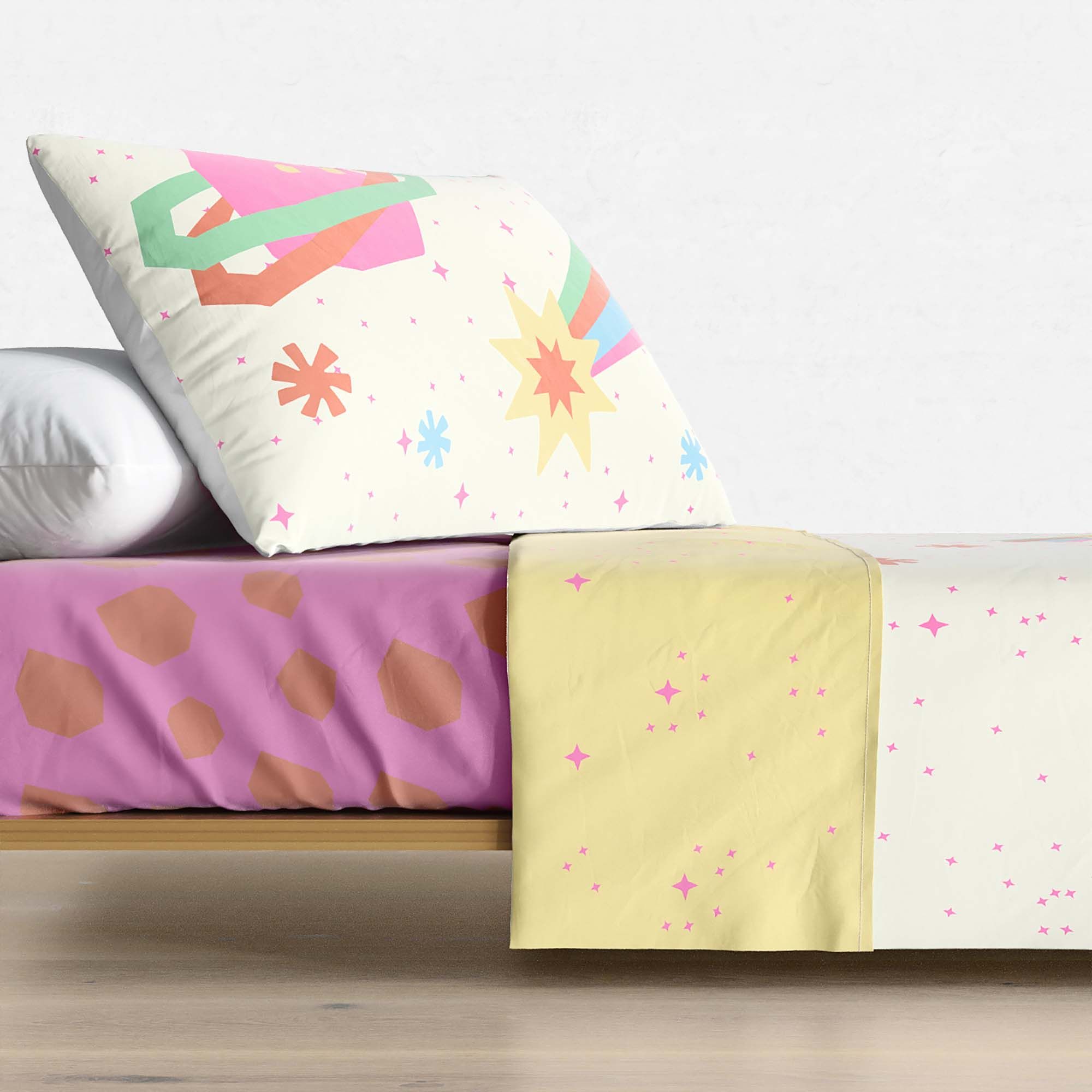 O conjunto vem com lençol de baixo com elástico, lençol de cima e fronha com estampas inspiradas no espaço sideral. Planetas coloridos e estrelas brilhantes em cores neon, adicionam um toque divertido, moderno e tecnológico aos quartinhos.