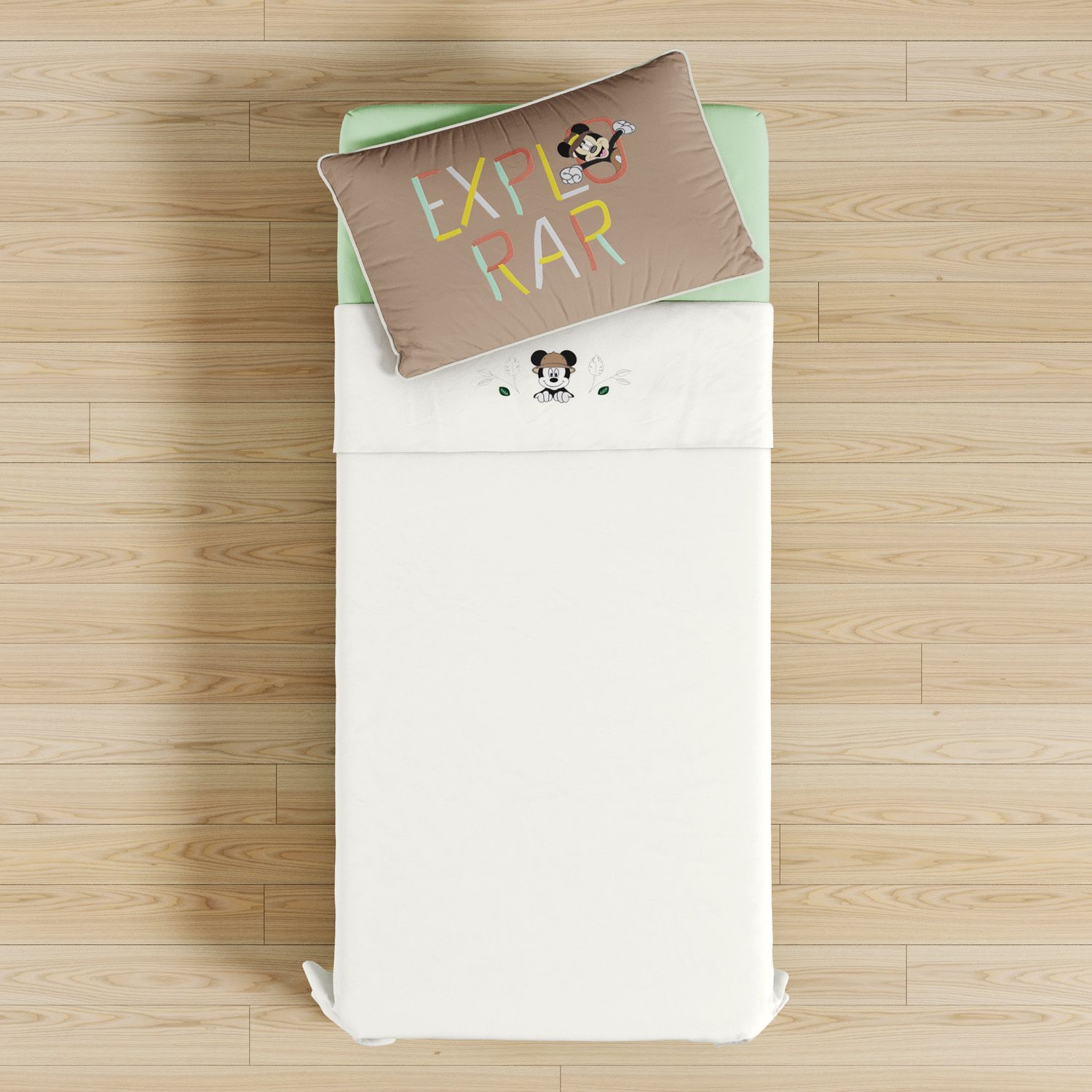 Confeccionada em tecido 100% algodão, o conjunto vem com três peças: lençol de baixo verde com elástico, fronha marrom e lençol de cima branco com bordados oficiais Disney inspirados no clássico personagem Mickey Mouse.