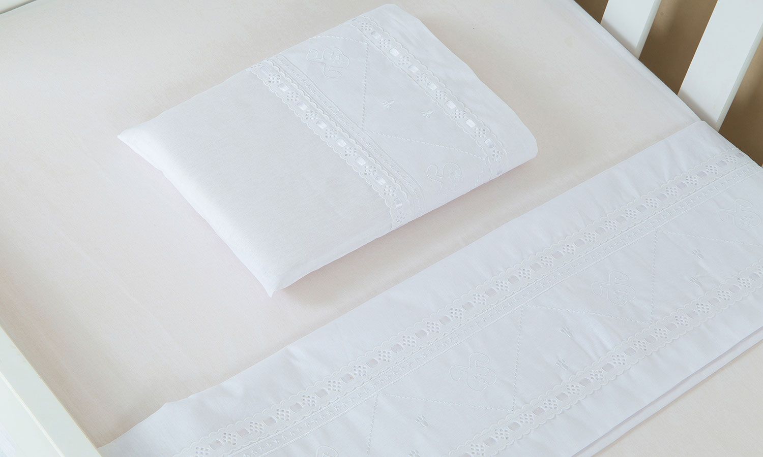 O Jogo de Lençol Mini Berço Coelho Branco é confeccionado com o macio tecido 100% algodão, perfeito para a pele sensível do recém-nascido. São três peças: lençol de cima, de baixo com elástico e uma fronha. Os bordados de coelhinho, estrelas, patinhas e detalhes de passa fita dão o toque de charme no conjunto.