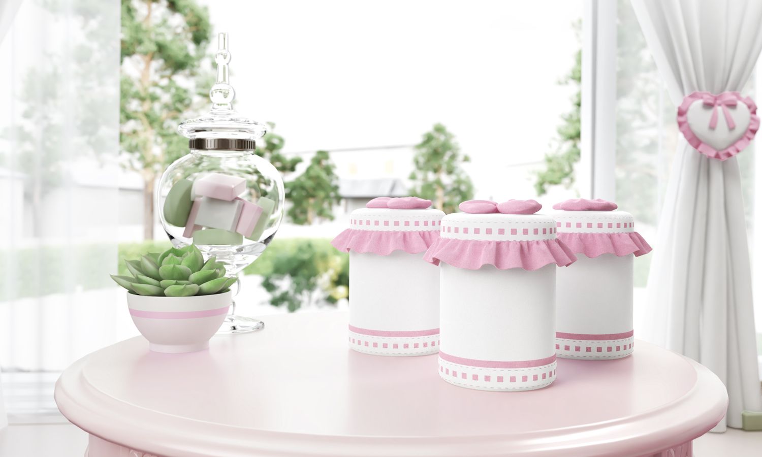 O Jogo de Potes da Coleção Alice Rosa será o maior ajudante das mamães na hora da troca de fraldas. Esse modelo com design exclusivo é composto por três lindos potes plásticos, revestidos com tecido branco e detalhes cor-de-rosa. O acessório serve para guardar produtos básicos para a higiene do bebê, como algodão, gaze e cotonete. Os babadinhos ao redor da peça acompanham um delicado laço na tampa, que adiciona charme ao cantinho da sua pequena. Aproveite para conferir o Kit Higiene completo da Coleção Alice Rosa.