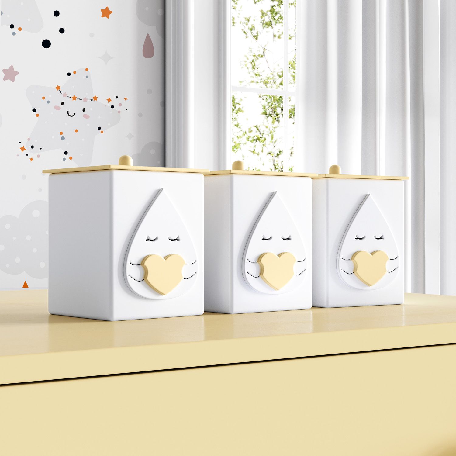 O Jogo de Potes Amiguinhas Nuvem Amarelo é perfeito para guardar pertences menores do seu amor, facilitando a rotina de cuidados diários.
