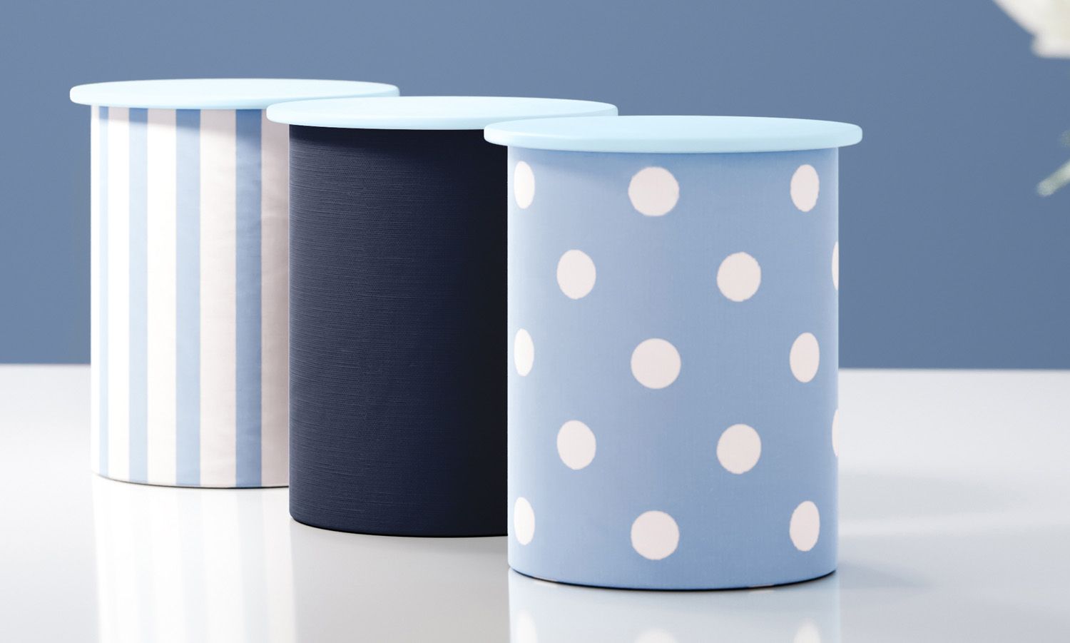 O Jogo de Potes Listras e Bolinhas Azul confere mais praticidade à rotina dos pais e originalidade à decoração do quarto de bebê. São três potinhos redondos de plástico resistente revestidos com tecidos em estampas clássicas, como poás e listras. Fácil de combinar com diversos estilos e temas, principalmente ambientes com inspiração náutica.