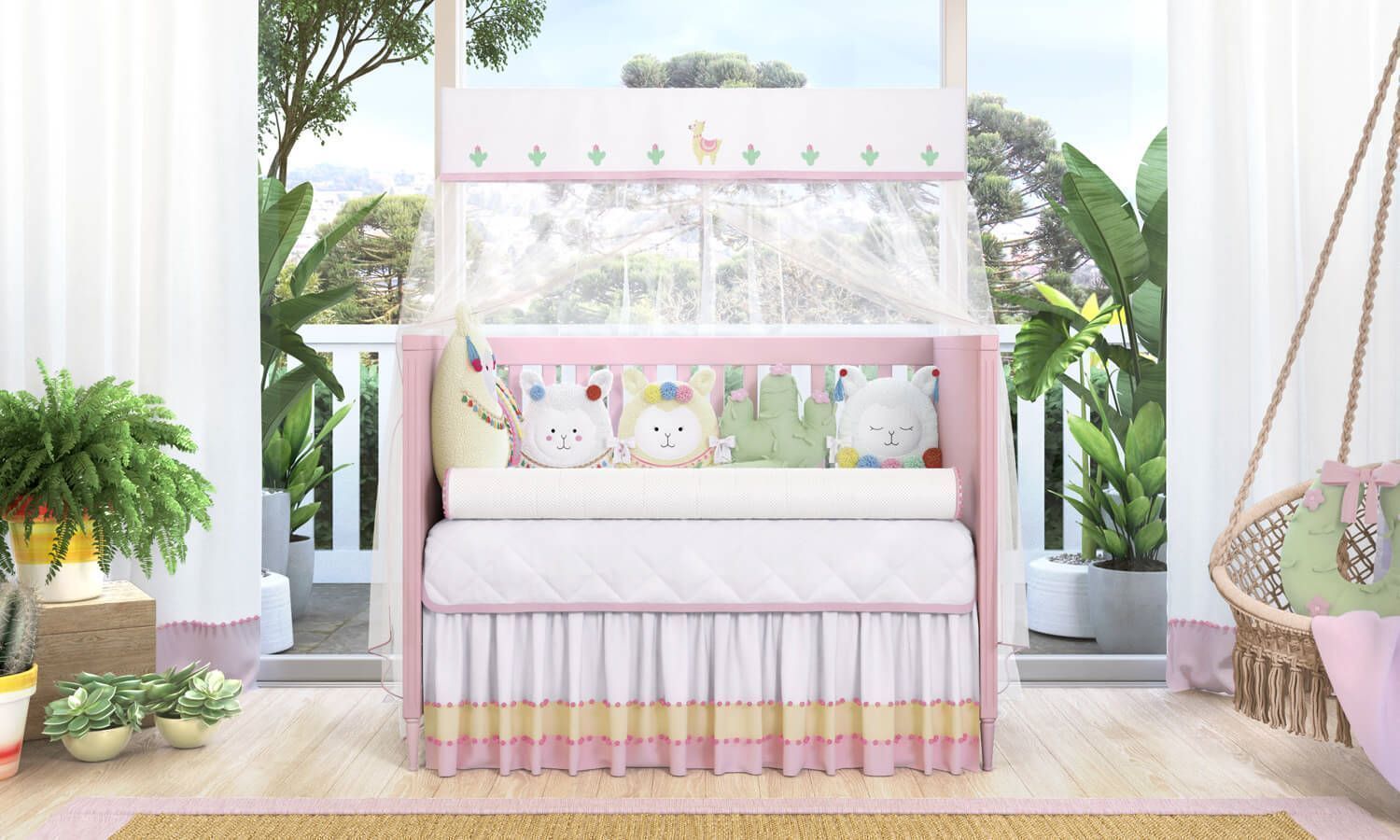 O Kit Berço Amiguinhas Lhamas – Linha Sabrina Sato Mom traz o aconchego e o charme das lhamas e cactos, com a influência do estilo étnico que traz ao quarto de bebê um conceito único.