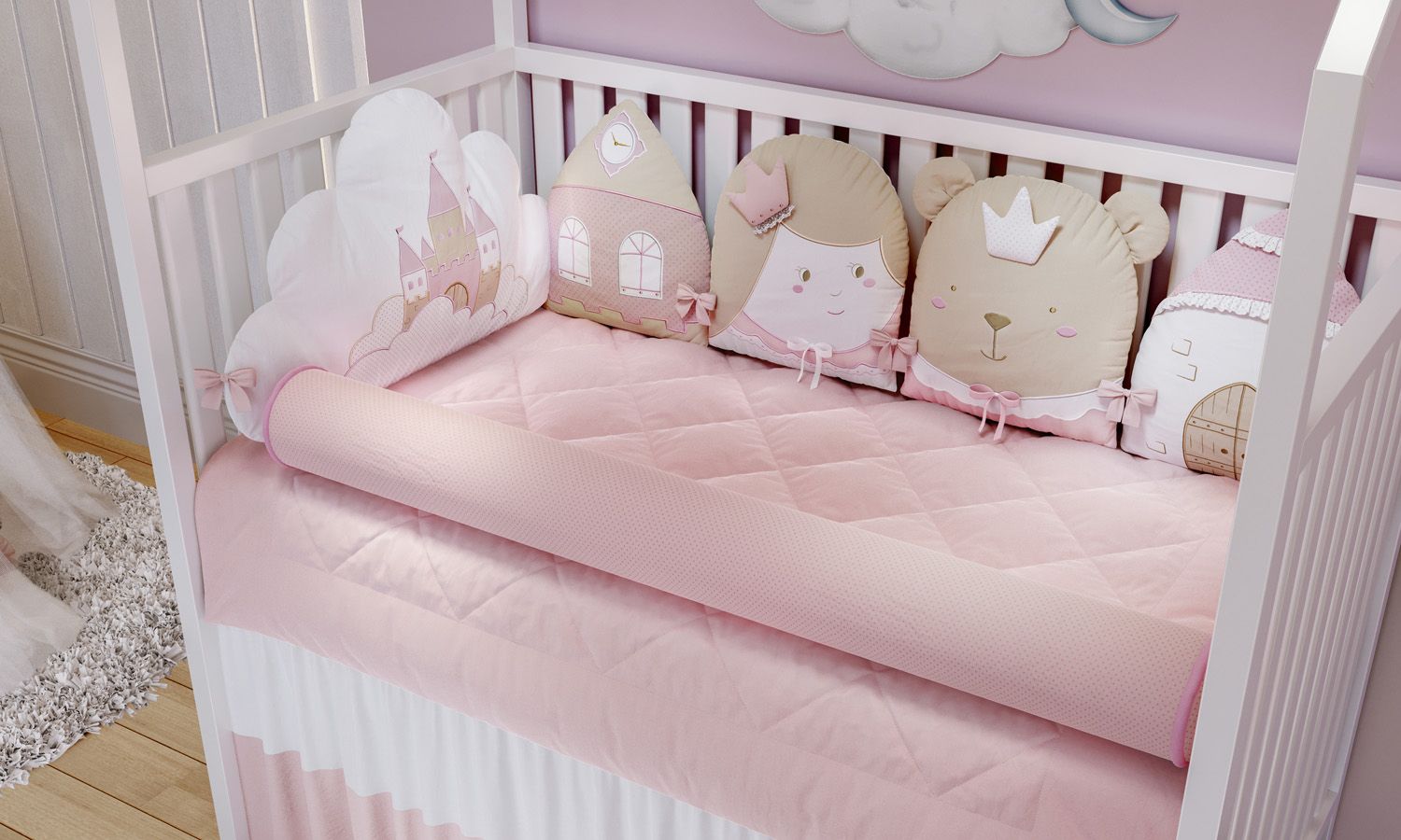O Kit Berço Amiguinhas Realeza é um verdadeiro sonho. São 12 peçasexclusivas, confeccionadas em tecido percal 100% algodão, para proporcionar o máximo de conforto e aconchego para a sua princesa. Os detalhes clássicos ficam por conta dos babadinhos e matelassê em tons sofisticados, característica da decoração clássica que as mamães de menina tanto amam.
