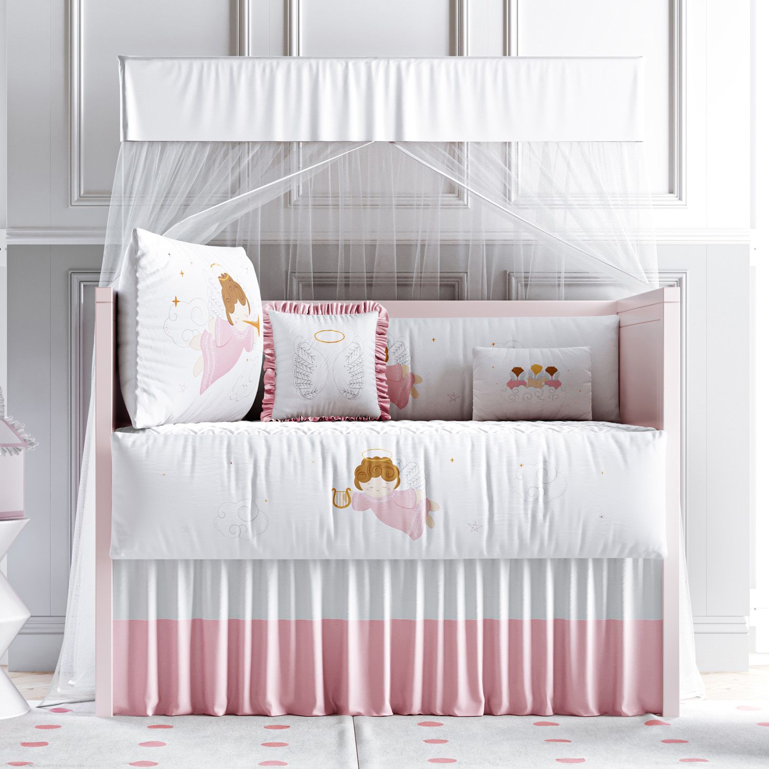 O Kit Berço Anjinha Rosa traz estampas exclusivas em alta definição para compor a decoração do quarto de bebê com aconchego e originalidade. Um enxoval com cores suaves para receber a nova menina da família com muito amor. Entre nuvens e estrelinhas, anjos com harpas representam a harmonia e a pureza. Confira os detalhes e encante-se com esse produto original Grão de Gente: