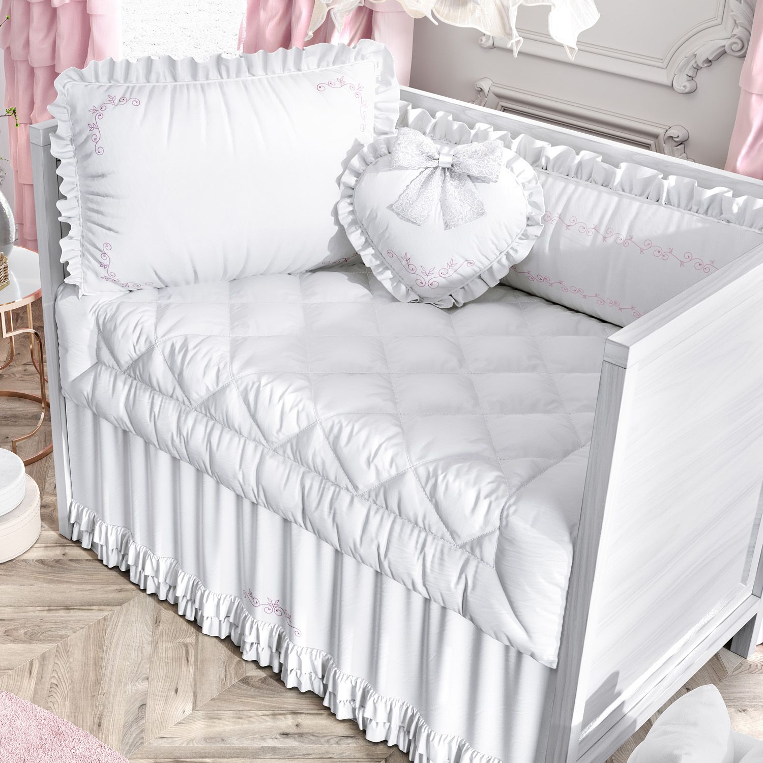 A pureza desse enxoval branco é exaltada pelo toque suave do tecido 100% algodão, do jogo de lençol completo e do edredom acolchoado em matelassê. Você ainda pode contar com a proteção e o charme extra do mosquiteiro varal de tule com bandô decorativo. Uma escolha clássica que transforma o quarto dos sonhos da sua princesinha em um mundo de delicadeza e romantismo.
