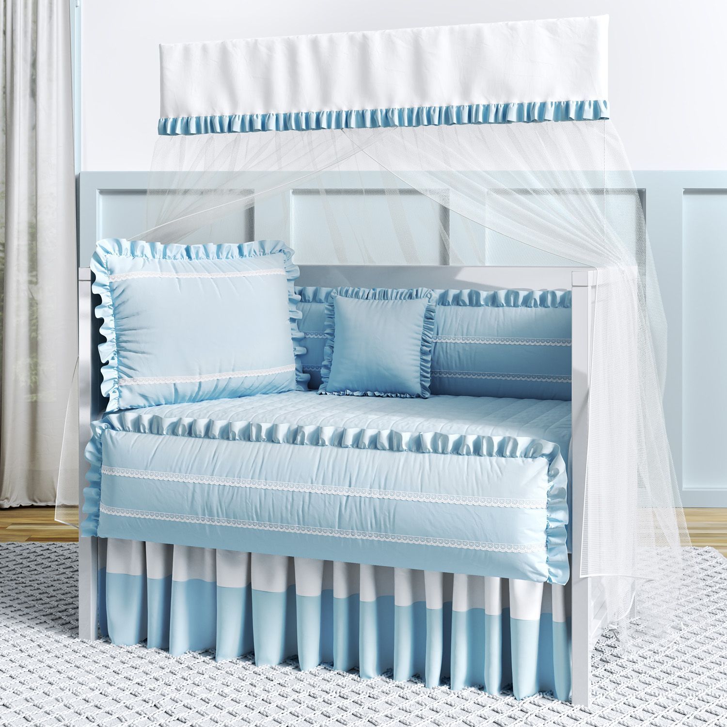 O Kit Berço Azul é um enxoval com estilo clássico, detalhes em rendinhas brancas e babados, confeccionado com o exclusivo tecido 100% algodão, produzido aqui na Grão de Gente especialmente para os nossos produtos. Um conjunto completo para proporcionar conforto e proteção ao recém-nascido, sem abrir mão de um visual de extremo bom gosto e sem excessos na decoração do quarto de bebê.
