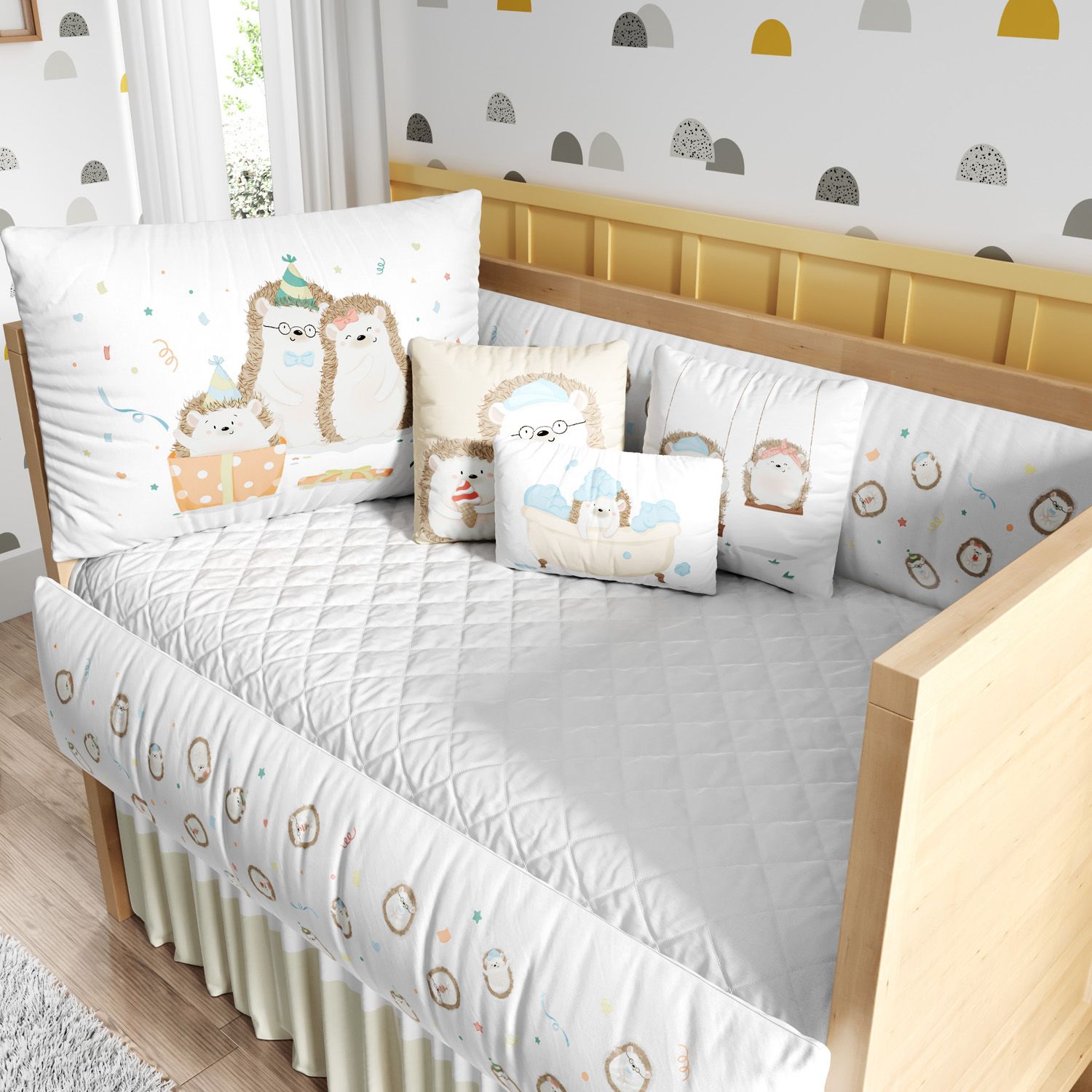 O Kit Berço Família Porco Espinho traz estampas exclusivas em alta definição para compor a decoração do quarto de bebê com aconchego e originalidade. Um enxoval encantador para receber o novo bebê da família com muito amor. Na cabeceira, papai e mamãe porco-espinho observam seu presente mais lindo! Nas laterais, uma estampa repleta de bichinhos, corações e estrelas. Confira os detalhes e encante-se com esse produto original Grão de Gente: