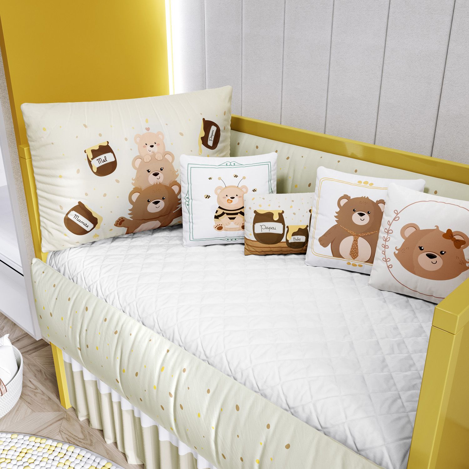 O Kit Berço Família Ursinho traz estampas exclusivas em alta definição para compor a decoração do quarto de bebê com aconchego e originalidade. Um enxoval encantador para receber o novo bebê da família com muito amor. Na cabeceira, um pequeno ursinho junto dos pais e potes de mel! Nas laterais, uma estampa poá artsy em tons de bege, creme e marrom. Confira os detalhes e encante-se com esse produto original Grão de Gente: