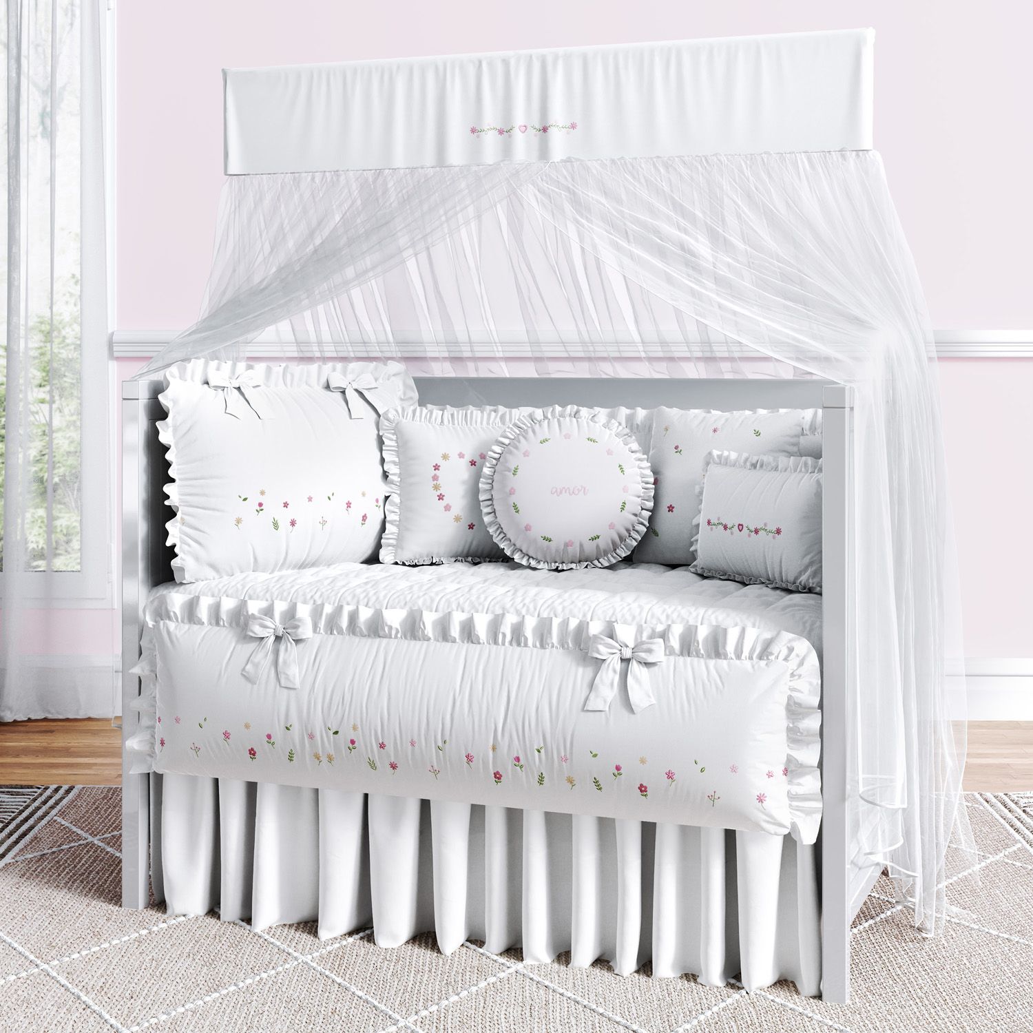 Com visual girlie e suave, o enxoval transmite aconchego e beleza para o décor, graças à delicadeza dos bordados de flores, raminhos e corações.