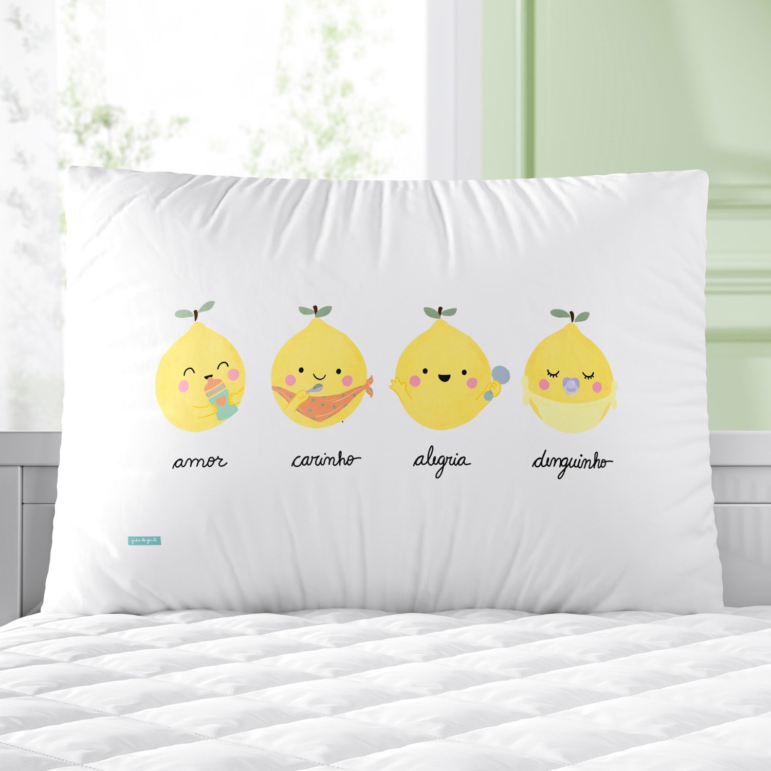 A leveza e a tropicalidade da estampa tem tudo a ver com o Brasil. Suas cores lembram o verão, estação muito querida que remete à felicidade e aos dias gostosos de férias que passamos em família. Na cabeceira, os limões com rostinho convidam a família para um verdadeiro show de fofura com palavras amorosas, desejando amor, carinho, alegria e muito denguinho. O destaque vai para o edredom e o bandô do mosquiteiro, que são estampados!