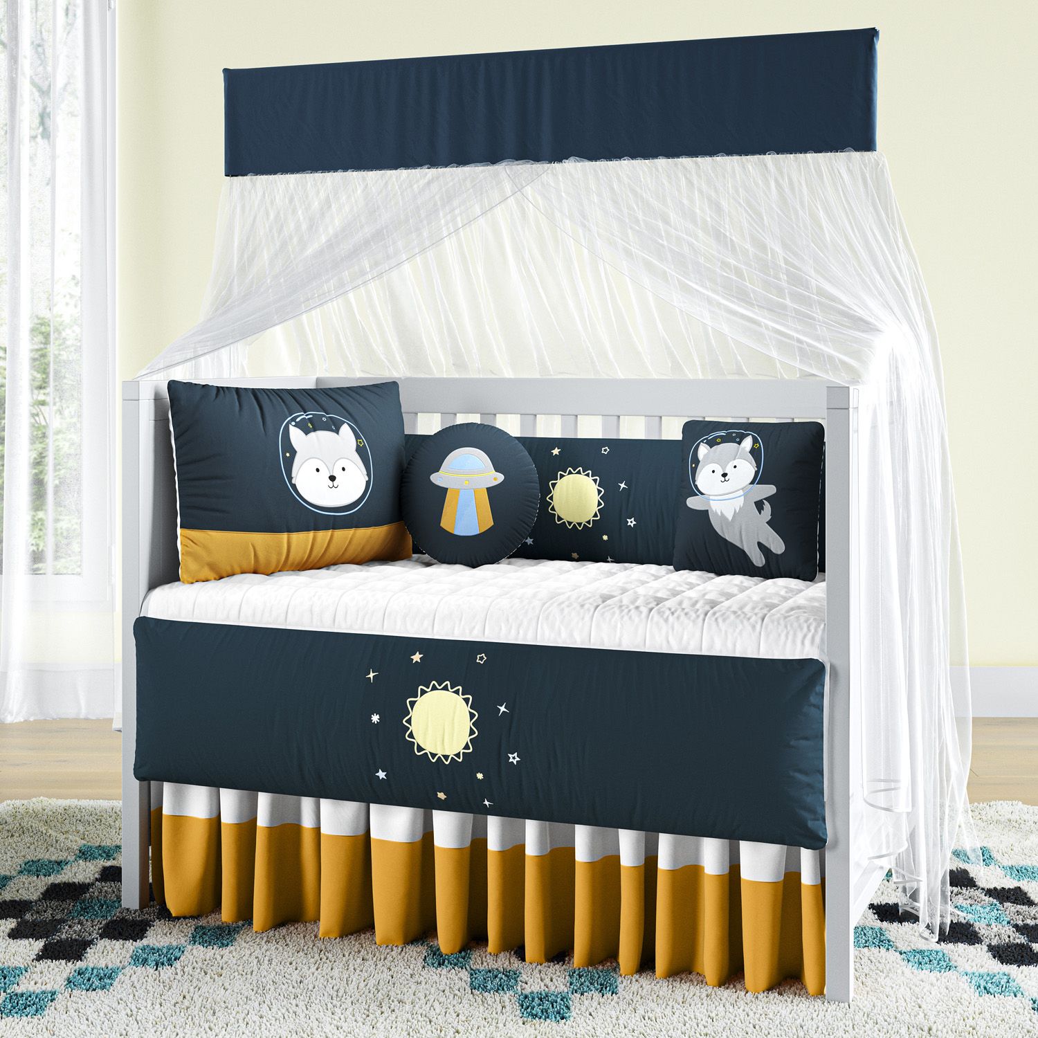 Em tons de azul marinho e amarelo mostarda, a cabeceira com o personagem principal dessa aventura é puro charme, além dos protetores laterais com bordados exclusivos!