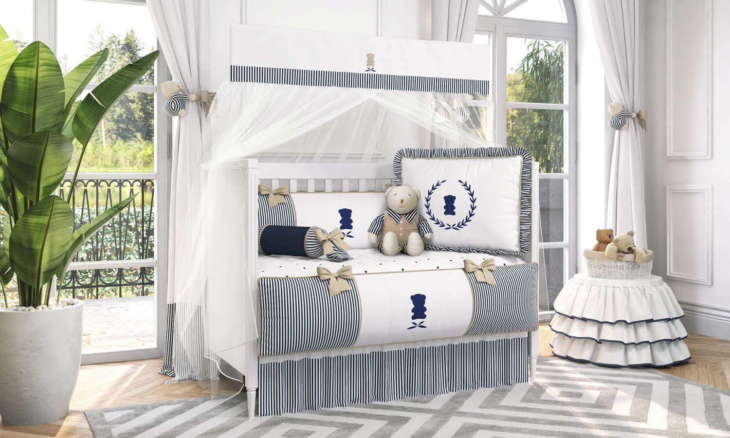 Finalizando esse conjunto, o mosquiteiro tem papel essencial na segurança do seu amor no berço. Para proteção do neném, os médicos não recomendam a utilização de repelentes antes que o recém-nascido complete seis meses de vida. As cores azul marinho, branco e areia desse Kit Berço formam uma combinação charmosa e que se integra muito bem ao décor do quarto de bebê perfeito!
