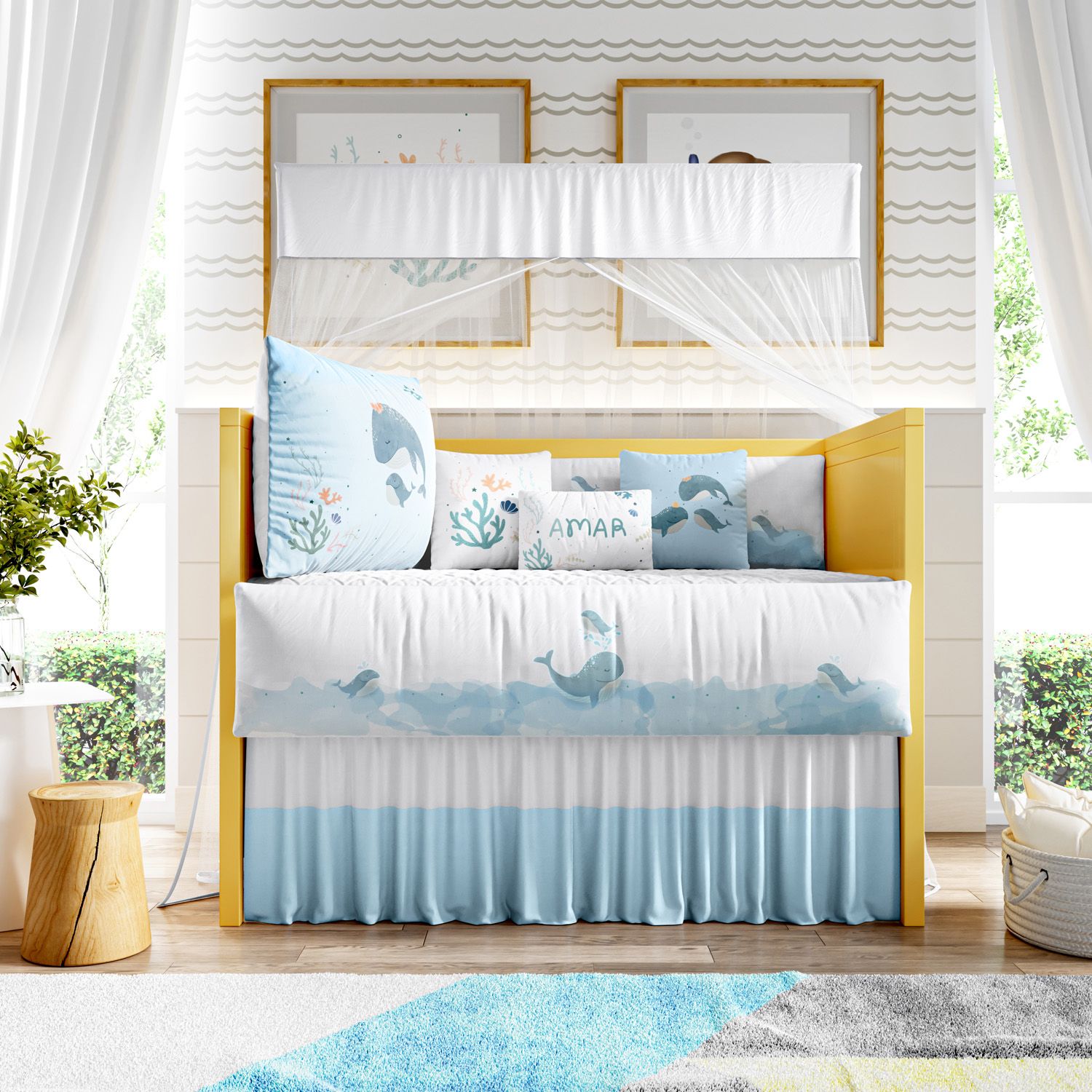 O Kit Berço Mamãe e Bebê Baleia traz estampas exclusivas em alta definição para compor a decoração do quarto de bebê com aconchego e originalidade. Um enxoval encantador para receber o novo bebê da família com muito amor. Na cabeceira, mãe e filhote nadam com algas e corais. Nas laterais protetoras, a família se diverte em ondas pintadas originalmente em aquarela para depois virarem estampa. Confira os detalhes e encante-se com esse produto original Grão de Gente: