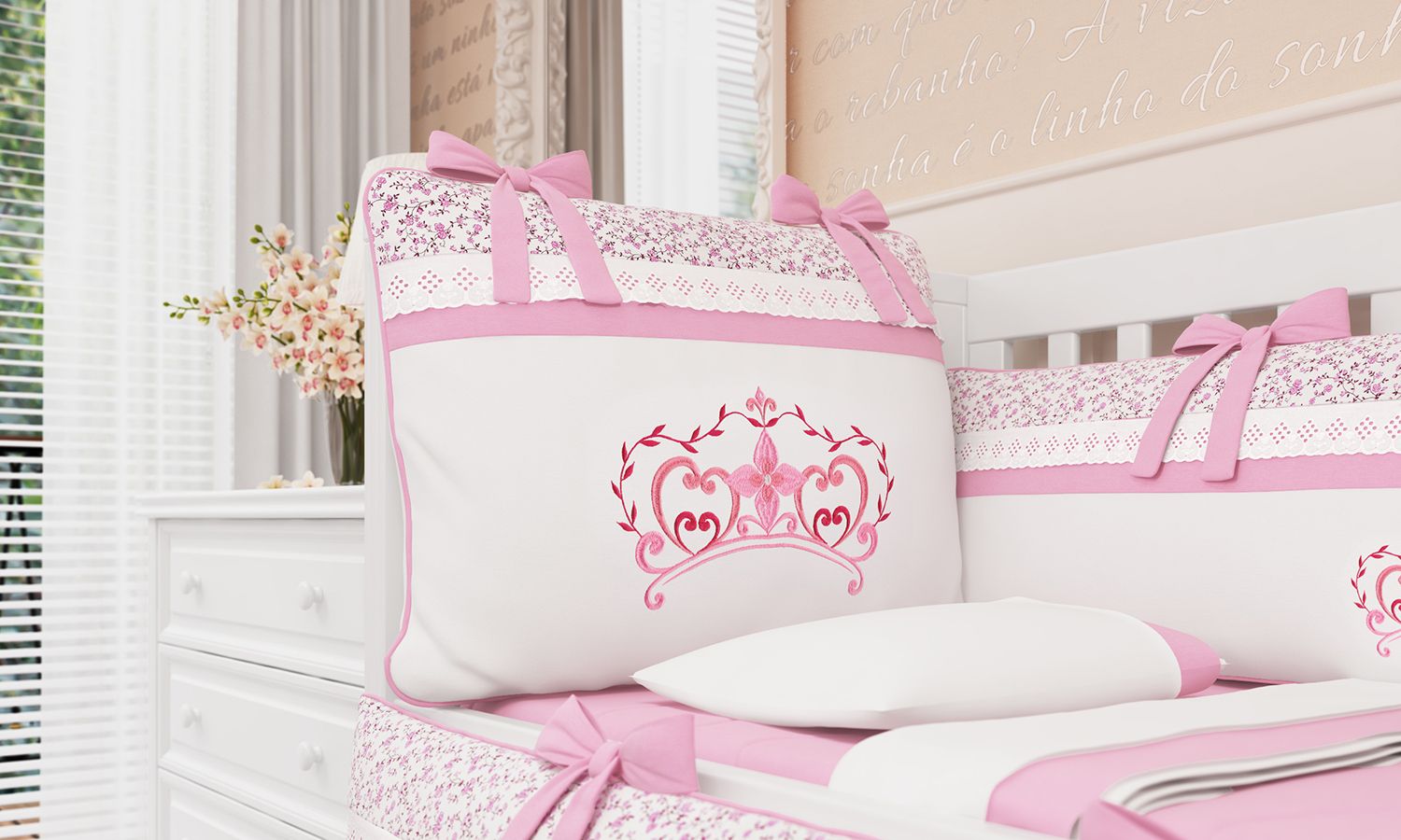 O Kit Berço Minha Princesinha vai transformar a decoração do quarto de bebê num pedacinho de conto de fadas! A coroa delicada, formada com ramos, corações e flores, enfeita a cabeceira e as duas laterais do protetor de berço com graça e sofisticação. Com tecido 100 % algodão e enchimento fofinho este kit vai dar o conforto necessário para seu bebê nos primeiros meses de vida, além de beleza e requinte para o bercinho.