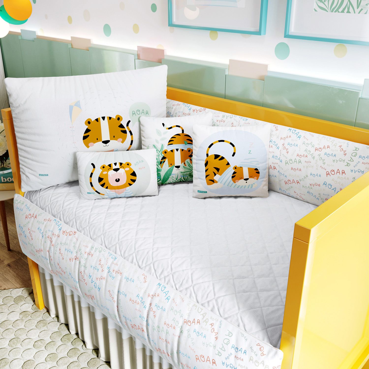 O Kit Berço Tigrinho Roar traz estampas exclusivas em alta definição para compor a decoração do quarto de bebê com aconchego e originalidade. Um enxoval encantador para receber o novo menino da família com muito amor. Na cabeceira, um filhote de tigre de camiseta segurando sua pipa. Nas laterais protetoras, a palavra roar se repete em várias cores adicionando descontração ao ambiente. Confira os detalhes e encante-se com esse produto original Grão de Gente: