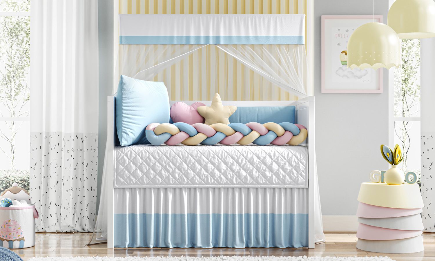 Kit Berço Trança Colorida Azul Claro, Rosa e Amarelo