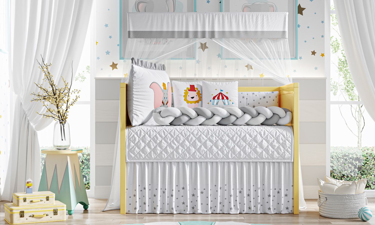Só a Grão de Gente para trazer o mundo mágico da Disney para a decoração do quarto do seu bebê! O Kit Berço Trança Dumbo Estrelinha é um conjunto completo com 9 peças para aconchegar e proteger seu amor. Esse enxoval exclusivo, confeccionado com materiais de qualidade e enchimento fofinho, possui uma linda cabeceira com bordado do Dumbo e uma lateral estampada de estrelinhas. Além disso, já vêm com zíper, para facilitar a lavagem, e amarril, para fixação no berço. Indicado para berços com padrão americano ou nacional.