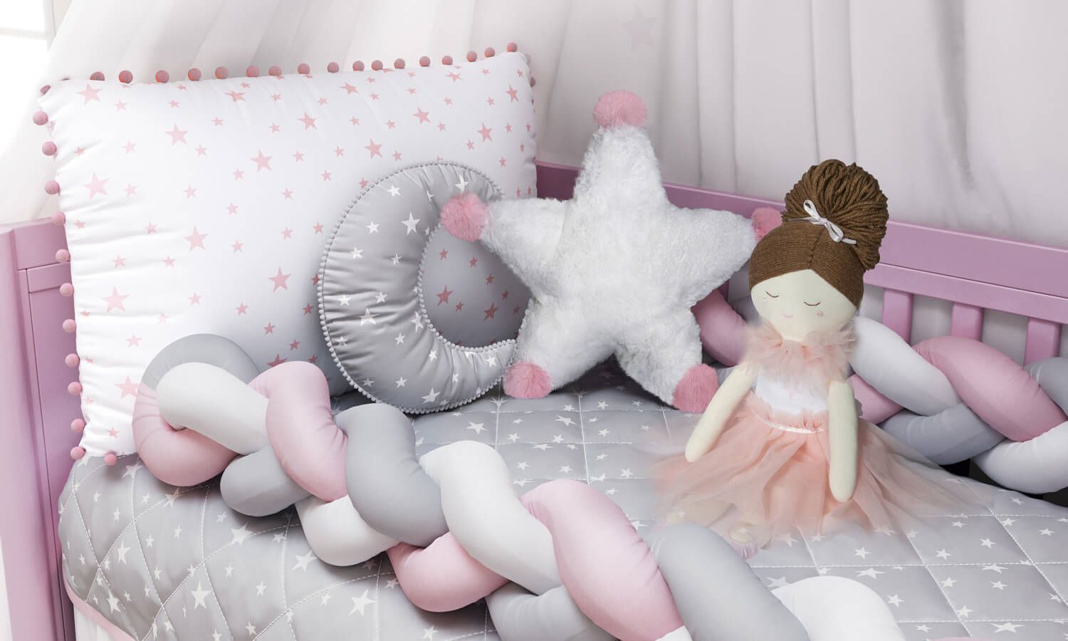Kit Berço Trança Estrelinhas e Pompons Rosa