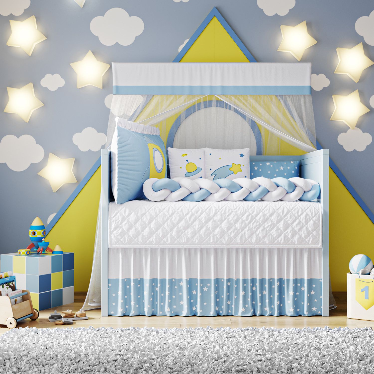 Contagem regressiva para decolar! O Kit Berço Trança Foguete Azul é um produto exclusivo da Grão de Gente, maior marca da América Latina em enxoval e decoração para quarto de bebê. Um conjunto completo com tudo o que você precisa para aconchegar e proteger sua bebê com materiais de qualidade e enchimento fofinho. O protetor lateral e a cabeceira vêm com zíper, para facilitar a lavagem, e amarril, para fixação no berço.