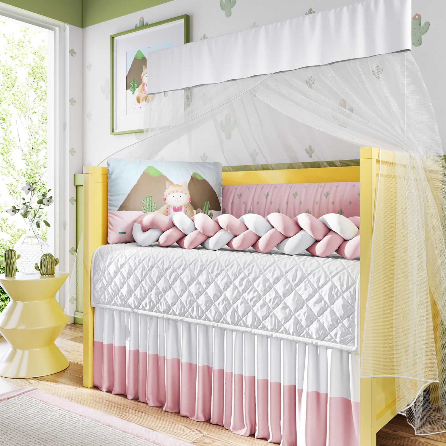 O Kit Berço Trança Lhama e Cactos traz estampas exclusivas em alta definição para compor a decoração do quarto de bebê com aconchego e originalidade. Esse enxoval com cores suaves é uma ótima escolha para receber a nova menina da família com muito amor e um toque de inspiração étnica. Uma carismática “lhamita” nas cordilheiras enfeita a cabeceira ao lado de cactos. Confira os detalhes e encante-se com esse produto original Grão de Gente: