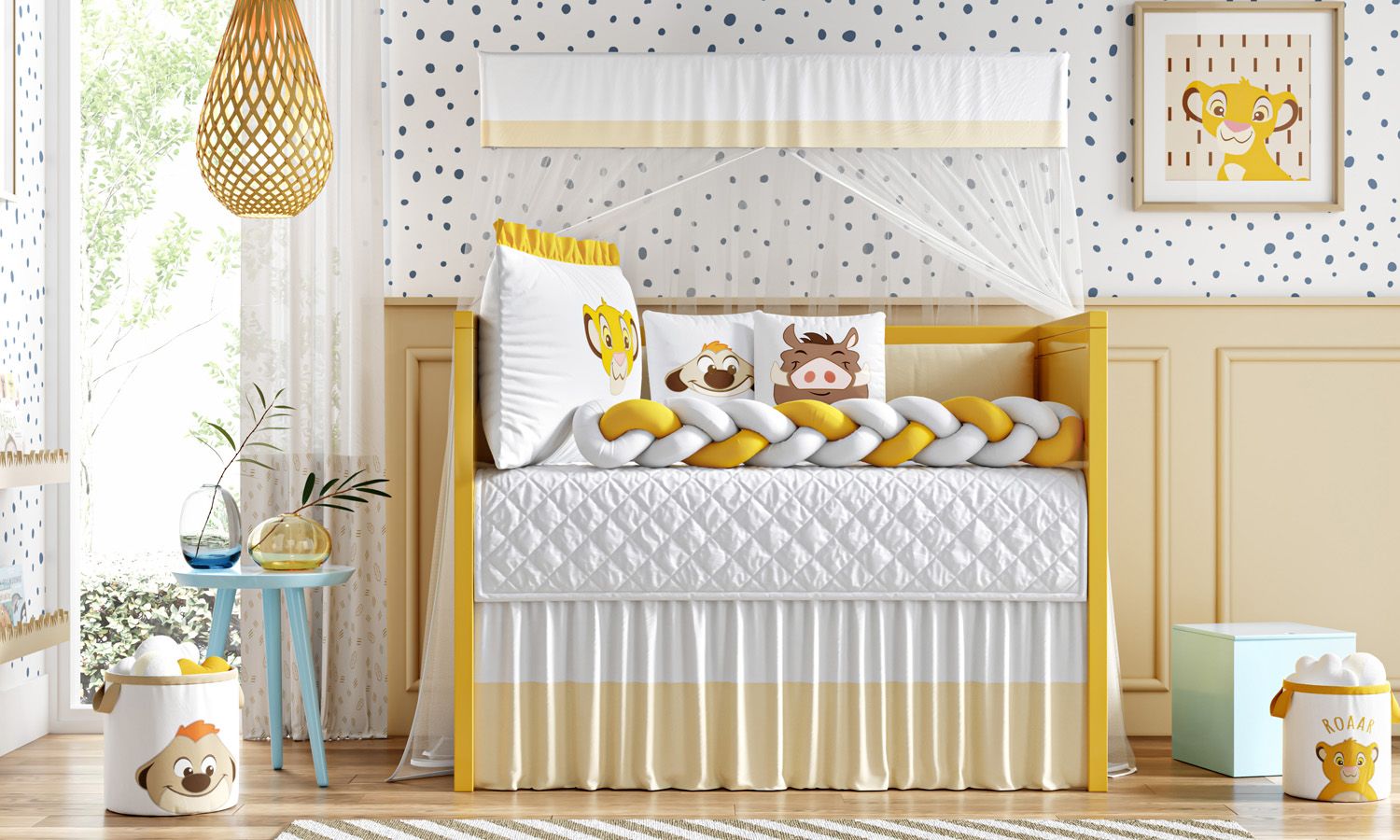 Só a Grão de Gente para trazer o mundo mágico da Disney para a decoração do quarto do seu bebê! O Kit Berço Trança Simba O Rei Leão é indicado para berço americano e nacional, um conjunto completo com 9 peças para aconchegar e proteger seu amor. Esse enxoval exclusivo, confeccionado com materiais de qualidade e enchimento fofinho, possui uma linda cabeceira com bordado do Simba, já vêm com zíper, para facilitar a lavagem, e amarril, para fixação no berço.
