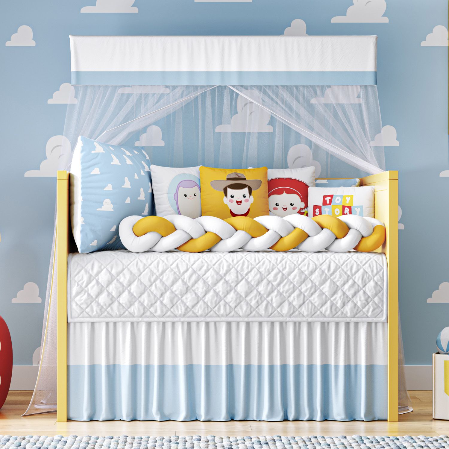 Só a Grão de Gente para trazer o mundo mágico da Disney e Pixar para a decoração do quarto do seu bebê! O Kit Berço Trança Toy Story Nuvem é Ideal para berço nacional ou americano, um conjunto completo com 9 peças para aconchegar e proteger seu amor. Esse enxoval exclusivo, confeccionado com materiais de qualidade e enchimento fofinho, traz na cabeceira e na lateral a estampa de nuvens que decora as paredes do quarto do Andy. Além disso, já vêm com zíper, para facilitar a lavagem, e amarril, para fixação no berço. Indicado para berços com padrão americano ou nacional.