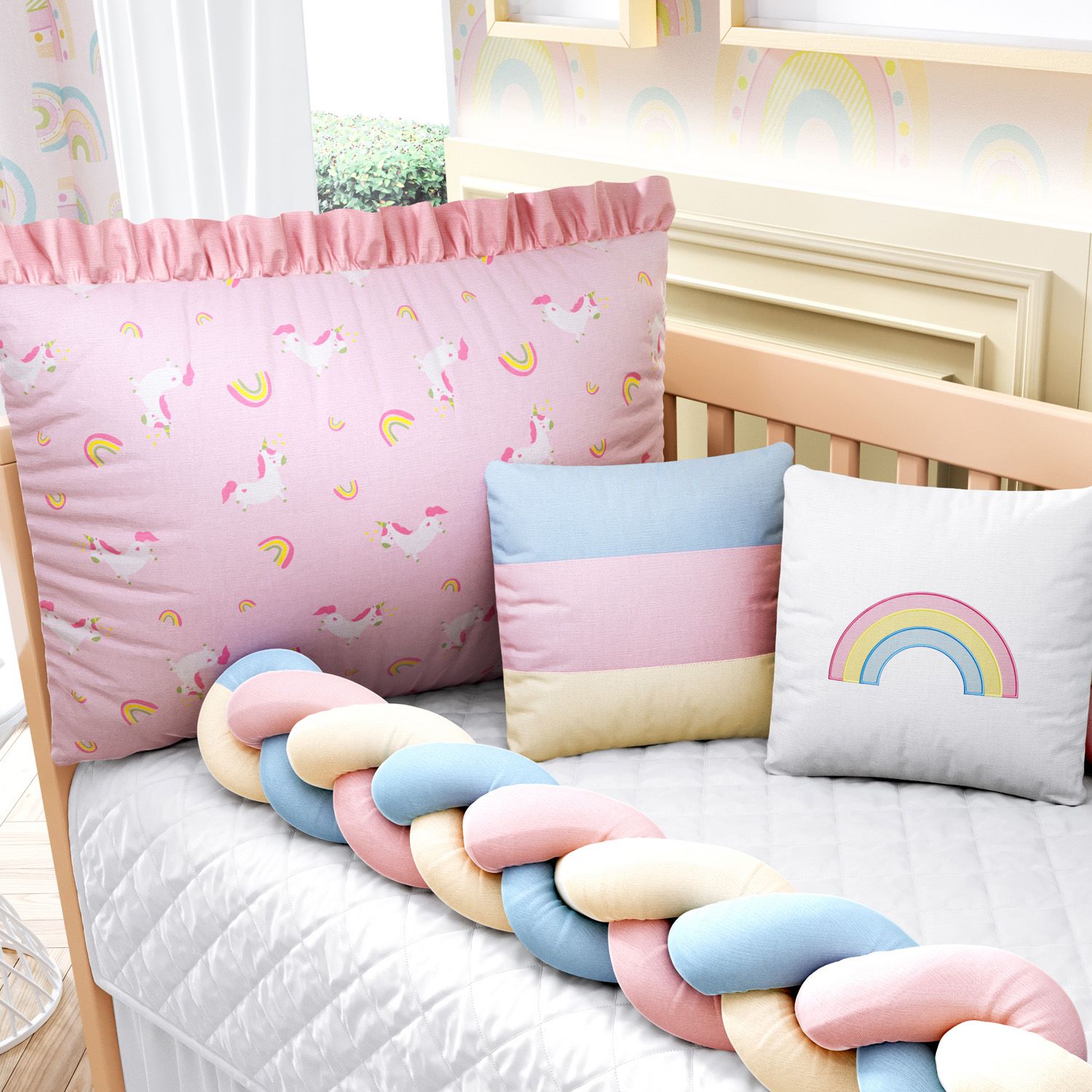 Uma tendência colorida para o quartinho da sua pequena! O Kit Berço Trança Unicórnio Rosa é um produto exclusivo da Grão de Gente, principal marca da América Latina em enxoval e decoração para quarto de bebê. Um conjunto completo com tudo o que você precisa para aconchegar e proteger a sua menina com materiais de qualidade e enchimento fofinho. A cabeceira estampada vêm com zíper, para facilitar a lavagem, e amarril, para fixação no berço.