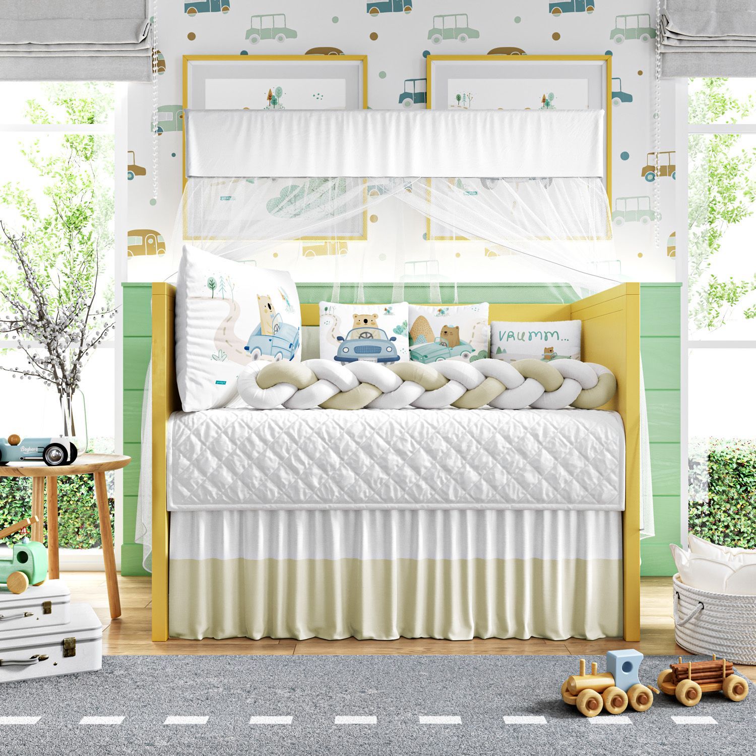 O Kit Berço Urso e o Carrinho traz estampas exclusivas em alta definição para compor a decoração do quarto de bebê com aconchego e criatividade. Um enxoval com estilo lúdico para receber o novo bebê da família com muito amor. Na cabeceira, um ursinho de gravata borboleta em seu carro conversível. O toque moderno do protetor lateral trançado finaliza o conjunto com visual impecável! Confira os detalhes e encante-se com esse produto original Grão de Gente: