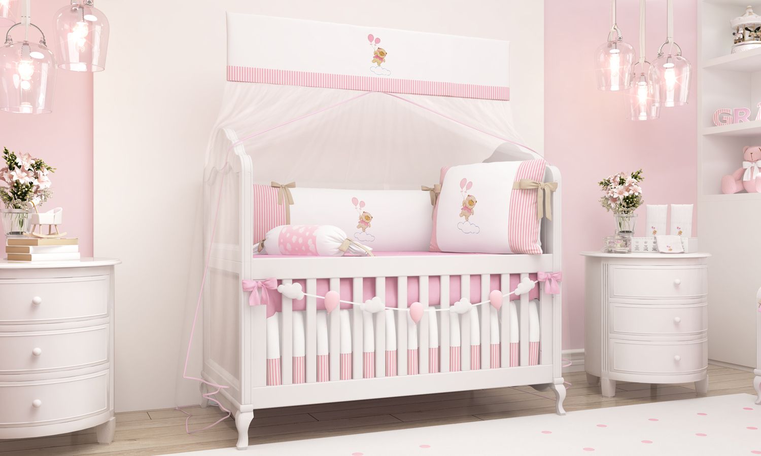 Uma pitada de inspiração lúdica e uma porção generosa de fofura deram origem ao Kit Berço Ursinha Nina e o Balão, que faz parte da nova coleção exclusiva Grão de Gente, para decorar o quarto de bebê com tons suaves de rosa, bege, estampa listrada e nuvens. Escolha perfeita para quem busca toques de originalidade e delicadeza, sem abrir mão do conforto, segurança e funcionalidade. O enxoval conta com 9 lindas peças, sendo um edredom rosa bem macio, um jogo de lençol completo 100% algodão (de cima, de baixo com elástico e fronha) e um mosquiteiro varal de tule com bando decorativo bordado.