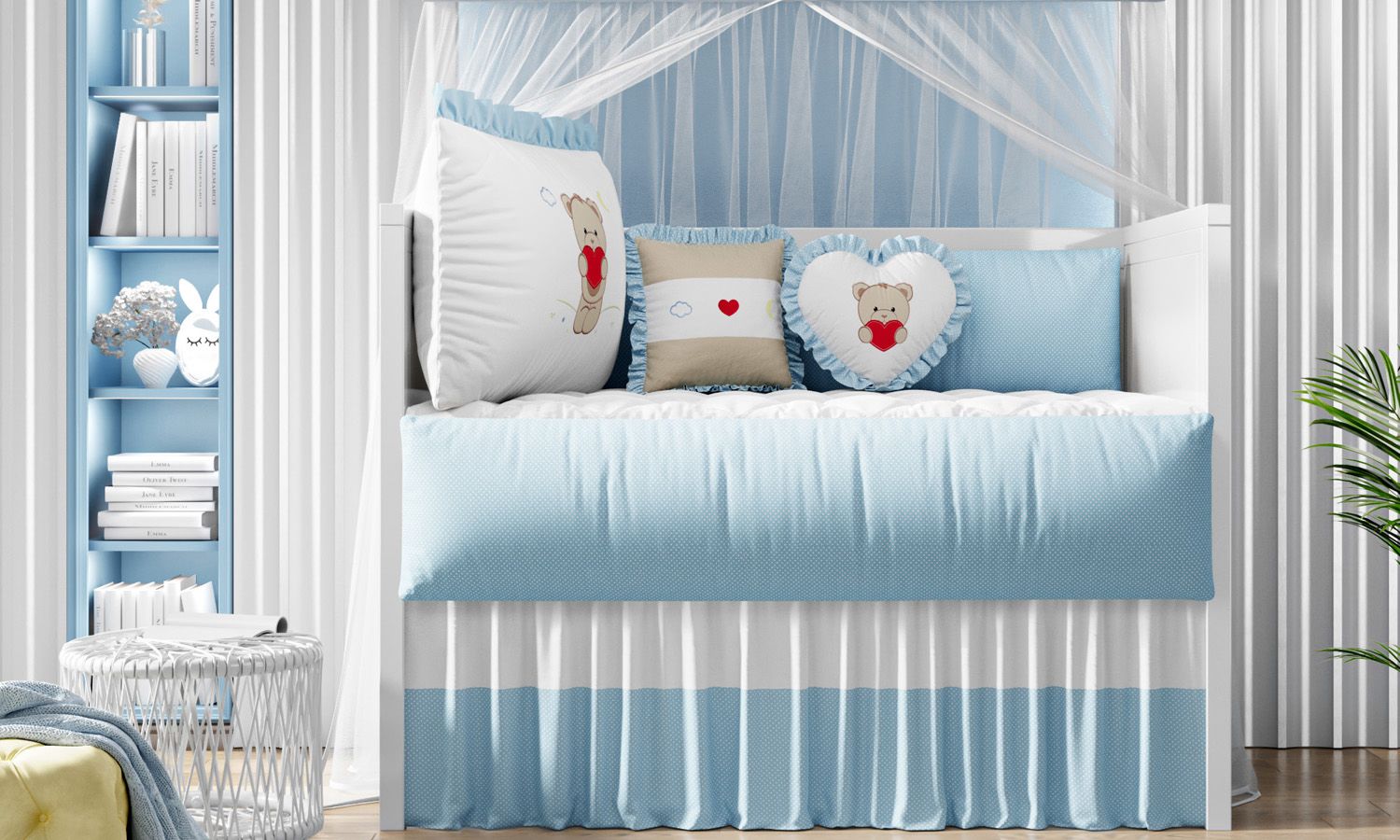 Um toque de carinho para o quartinho do seu menino! O Kit Berço Ursinho Coração Azul é um produto exclusivo da Grão de Gente, maior marca da América Latina em enxoval e decoração para quarto de bebê. Um conjunto completo com tudo o que você precisa para aconchegar e proteger seu bebê com materiais de qualidade e enchimento fofinho. O protetor lateral e a cabeceira vêm com zíper, para facilitar a lavagem, e amarril, para fixação no berço.