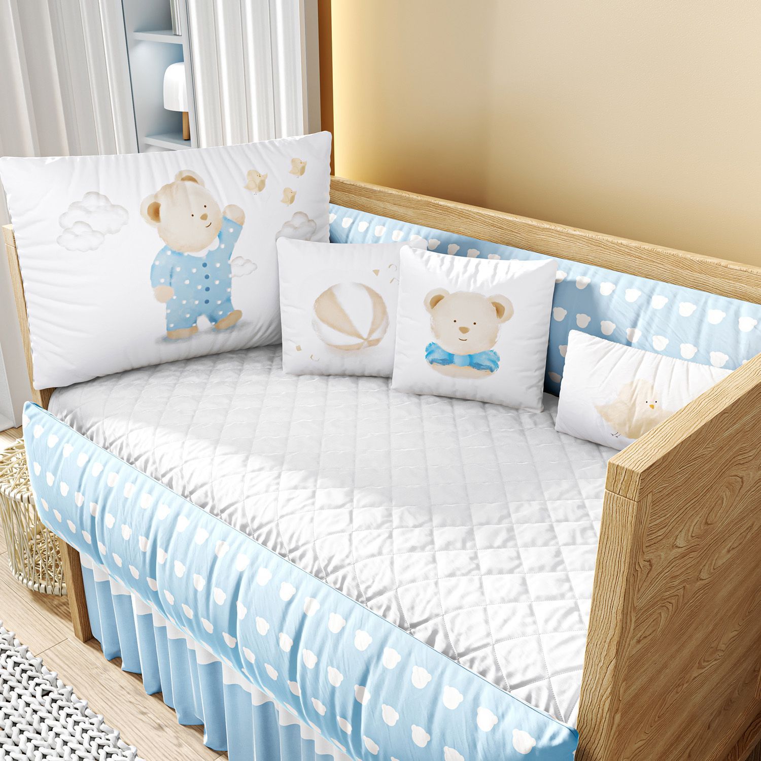 O Kit Berço Ursinho de Pijama Azul traz em sua cabeceira uma estampa exclusiva, criada em aquarela especialmente para a Grão de Gente. Um enxoval delicado e repleto de ternura para receber o novo príncipe da família com muito amor. Uma linda escolha para inspirar toda a decoração do quarto de bebê, com seus tons de bege e azul, além das laterais estampadas de poá ursinho.