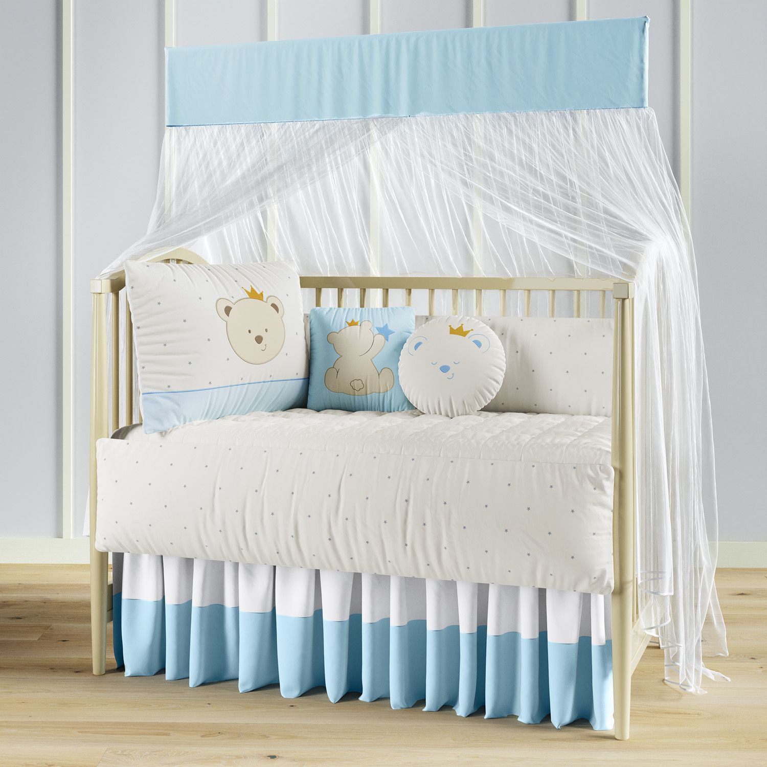 Para um quarto de bebê divertido e aconchegante, aposte no Kit Berço Urso com Coroa, criação original da Grão de Gente confeccionada com a maciez do nosso exclusivo tecido 100% algodão percal 180 fios.