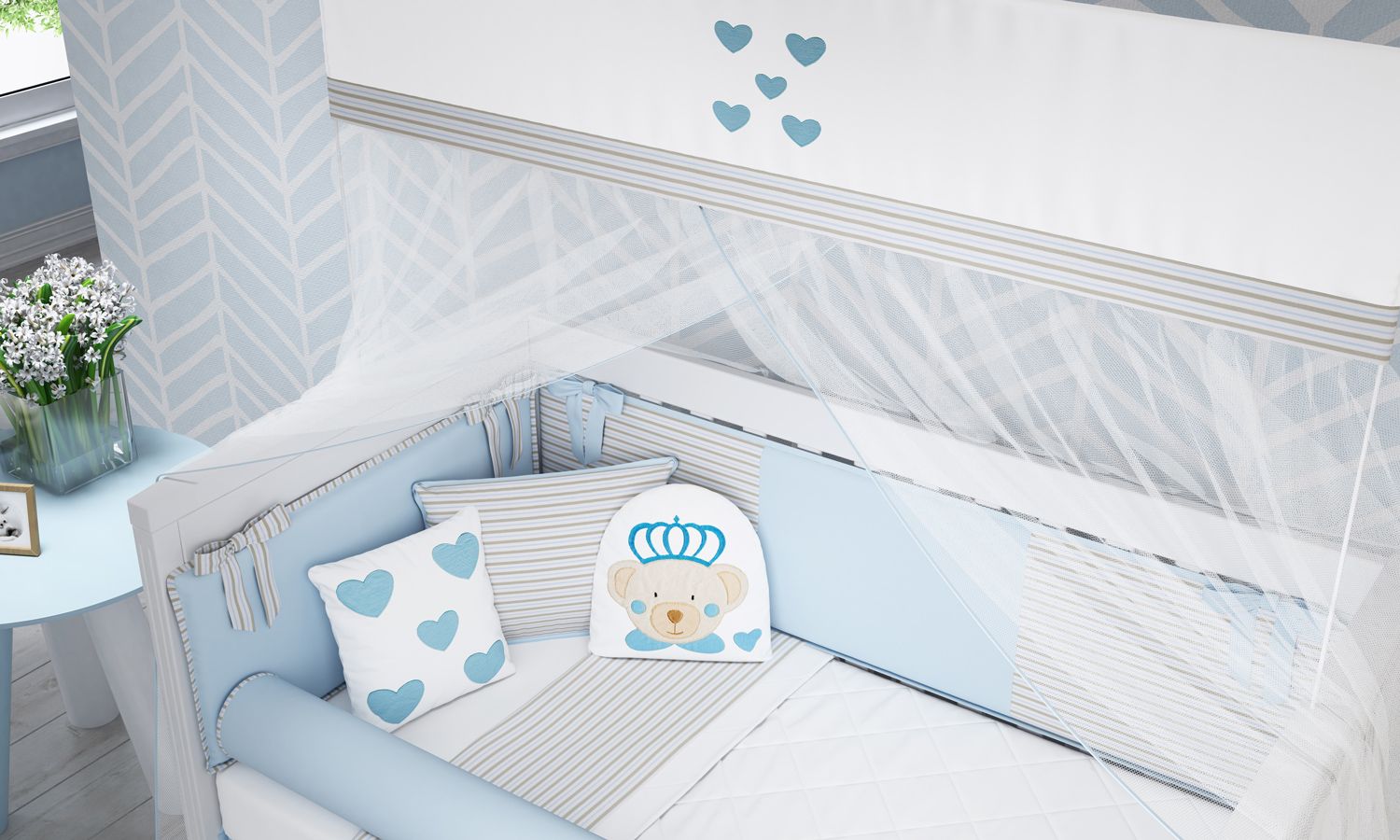 Da nobre coroa aos detalhes apaixonantes, o Kit Berço Urso Príncipe vai reinar no coração das mamães! Perfeito para ninar seu menino, o enxoval reúne tudo para a decoração do quarto de bebê perfeita: bom gosto, leveza e custo-benefício. São 11 peças belíssimas e funcionais, distribuídas entre edredom, protetor de berço, jogo de lençol, mosquiteiro e almofadas. Indicado para berço americano ou nacional, esse modelo exclusivo vai compor o bercinho de príncipe mais lindo com corações azuis e a clássica estampa listrada por todo o conjunto. Nessa Coleção, o estilo clean e infantil ganha espaço através dos mais delicados e exclusivos bordados, que aparecem numa suave paleta de cores.