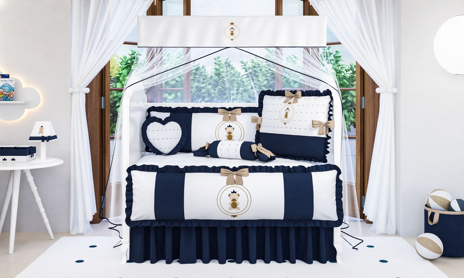 Pronto para embalar as noites do seu príncipe, o Kit Berço Urso Teddy Realeza ganhou a sofisticação do estilo clássico e compõe a decoração do quarto de bebê com nobreza! Ideal para berço nacional ou americano, as nove peças foram desenhas com todo o carinho da Grão de Gente e vão ninar o neném com muito conforto. O tecido que entra em contato direto com o recém-nascido é 100% algodão e assegura o bem-estar do pequeno, respeitando sua sensível pele. Já os enchimentos de fibra de poliéster siliconada deixam os produtos bem fofinhos e proporcionam todo o aconchego que o seu menino merece. Nesta coleção, laços, babados e belos bordados se destacam em uma elegante paleta de cores, que ditam o tema masculino com o azul-marinho, palha e branco.
