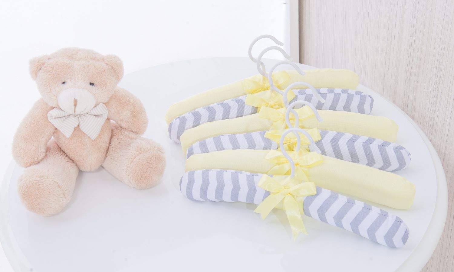 Confeccionado em madeira 100% MDF, o Kit Cabides Nova Iorque Chevron Amarelo é perfeito para evitar que as roupinhas do seu amor amassem. A aplicação de laços deixam os cabides ainda mais fofos!