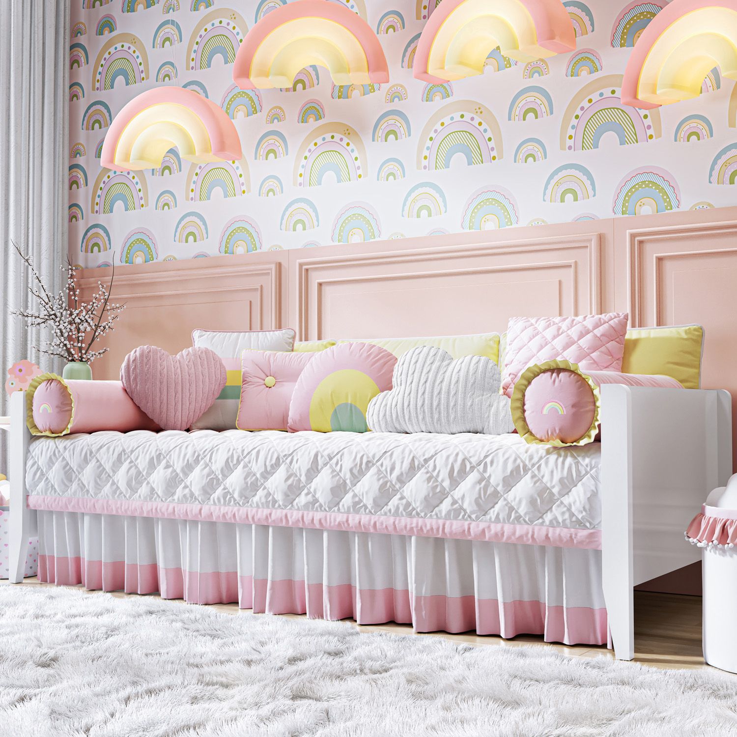 Um sonho colorido! O Kit Cama Babá Amiguinhas Arco-íris complementa a decoração lúdica e moderna do quarto de bebê da sua menina com delicadeza e conforto. Esse enxoval candy colors inclui um edredom acolchoado, três almofadas de encosto com acabamento em cordonê branco e dois rolos protetores laterais, com bordados de arco-íris, babadinhos e zíper para facilitar a lavagem.