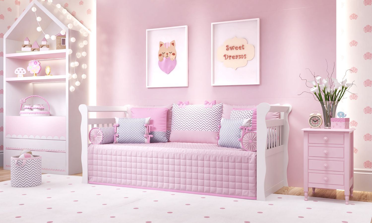 Kit Cama Babá da Coleção Amiguinhas é o conjunto perfeito para completar a decoração do quarto de bebê da sua gatinha! Esse enxoval exclusivo vai acomodar mamães, papais e vovós, além de receber as visitinhas com conforto e estilo. Um sonho infantil com a delicadeza dos tons de rosa, a moderna estampa poá e o divertido chevron zig-zag. São seis lindas peças, confeccionadas com tecidos de ótima qualidade especialmente para transformar a cama de solteiro num sofá impecável, que convida para ninar e descansar.
