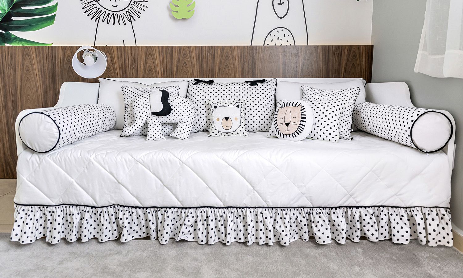 Uma composição que sintetiza carinho e conforto para recepcionar o seu amor e surpreender seus familiares. Nosso conjunto exclusivo é composto por uma colcha cobre leito com babado frontal, dois rolinhos protetores com estampa poá, duas almofadas para encosto brancas com visual clean, além da almofada central com uma padronagem charmosa de bolinhas e lacinhos pretos.