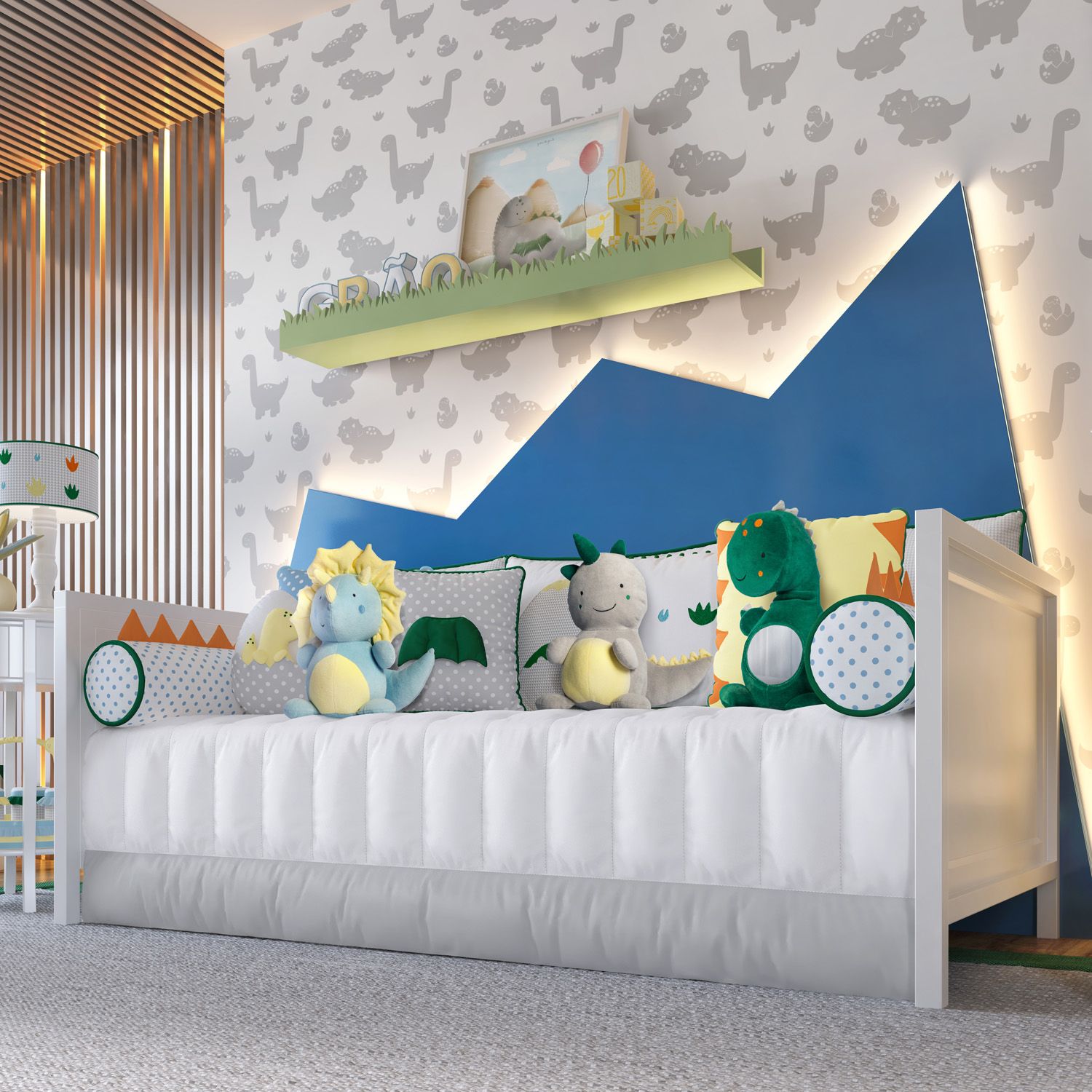 As peças do Kit Cama Babá Amiguinhos Dino tornam o quarto de bebê ainda mais completo e funcional! Esse conjunto traz todo o conforto do edredom cobre leito matelassê, três almofadas de apoio para encosto com zíper e mais dois rolinhos para as laterais.