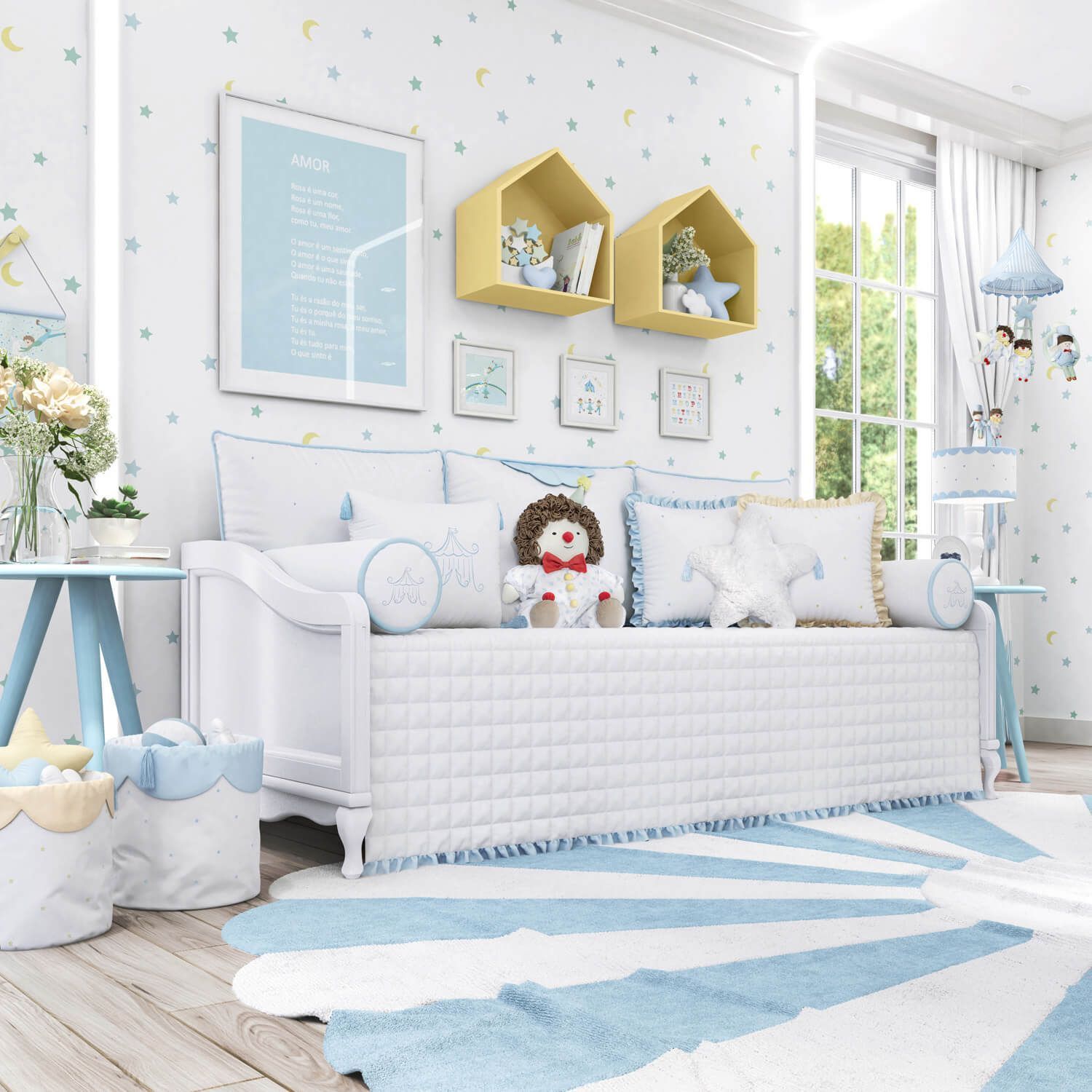 As seis peças transformam a cama babá num cantinho aconchegante que convida para ninar e descansar com todo o conforto do tecido e enchimento macio. O conjunto é composto por uma bela colcha cobre leito matelassê franzidas, além das almofadas bala para as laterais e os encostos, que já vêm com enchimentos e zíper que facilita a lavagem.
