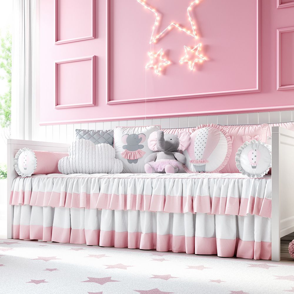 O Kit Cama Babá Elefantinha e o Balão é o complemento ideal para a decoração lúdica e romântica do quarto de bebê da sua menina. Esse enxoval rosa e branco esbanja delicadeza com sua belíssima colcha cobre leito com babado duplo, mais três almofadas de encosto com babadinhos e dois rolos protetores laterais bordados com balões. Aposte nas almofadas decorativas da Coleção Elefantinha e o Balão para acrescentar ainda mais conforto e aconchego ao cantinho da sua princesa!
