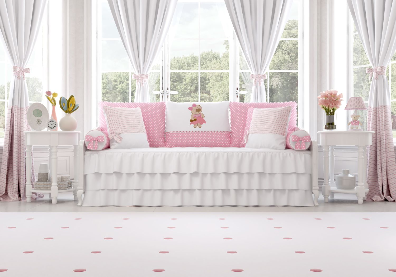 Uma encantadora estampa poá rosa compõe o conjuntinho com um tecido branco, sugerindo leveza e suavidade. Esse kit incrível ainda será usado por muito tempo, ideal para quando a pequena estiver crescidinha para a transição do berço para a cama. Aproveite e compre as almofadinhas decorativas vendidas separadamente para acrescentar mais conforto e estilo ao quarto de bebê!