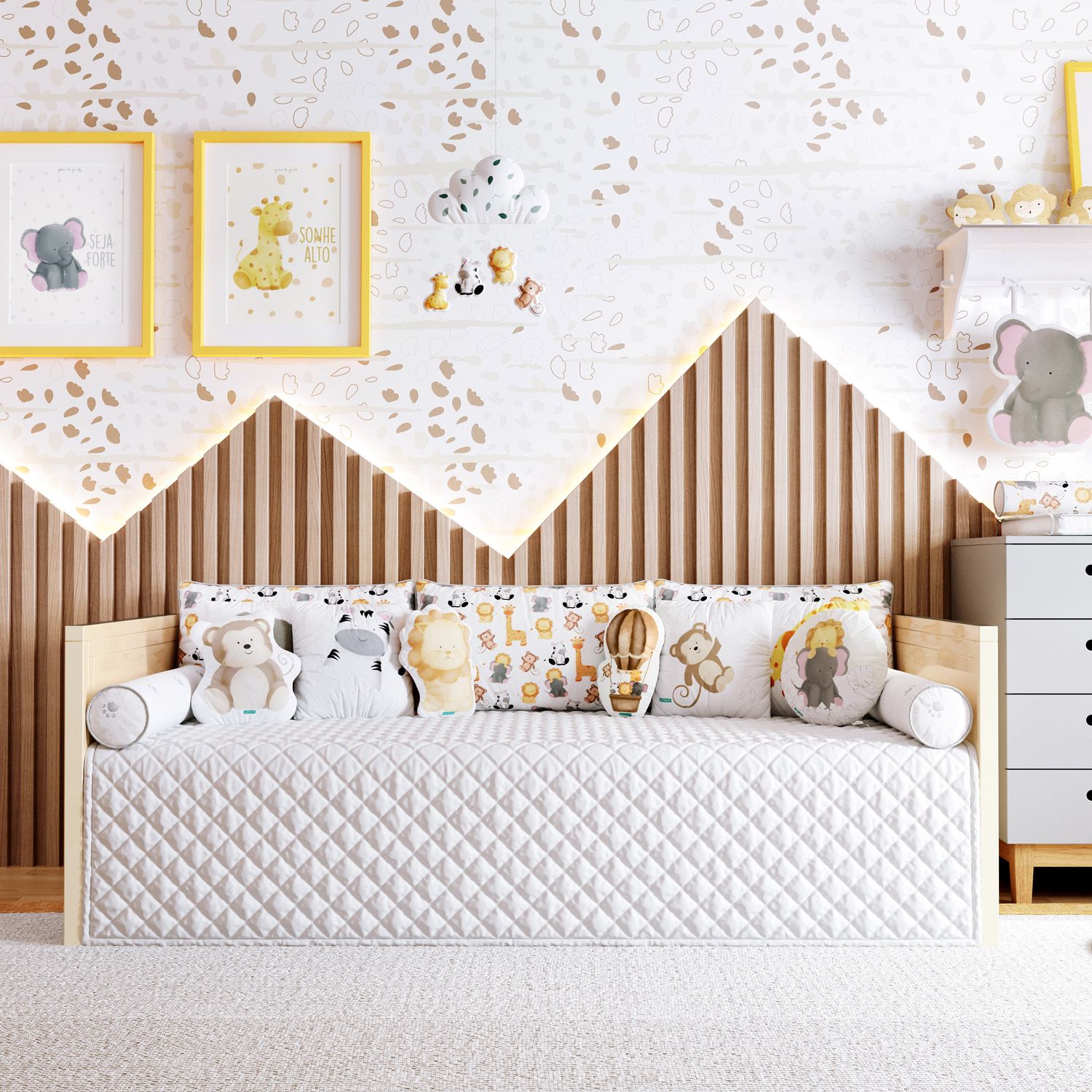 Criação exclusiva Grão de Gente, o Kit Cama Babá Safári Aquarela traz os personagens queridinhos da savana para completar a decoração do quarto de bebê e encantar toda a família!