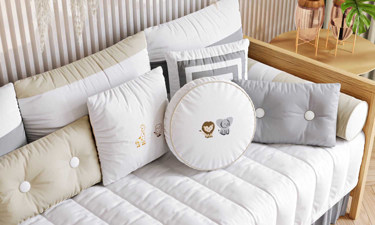Chegou a nova tendência Natural Chic da Grão de Gente! O Kit Cama Babá Safári Baby convida ao conforto e ao relaxamento misturando cores neutras e bordados lúdicos de bichinhos. Um enxoval clean, para meninos e meninas, com edredom acolchoado em matelassê, uma almofada central bordada, duas almofadas laterais com faixas cinza e dois rolos protetores, com zíper para facilitar a lavagem. Para completar a decoração de forma autêntica e sofisticada, invista nas almofadas decorativas do Quarto de Bebê Safári Baby!
