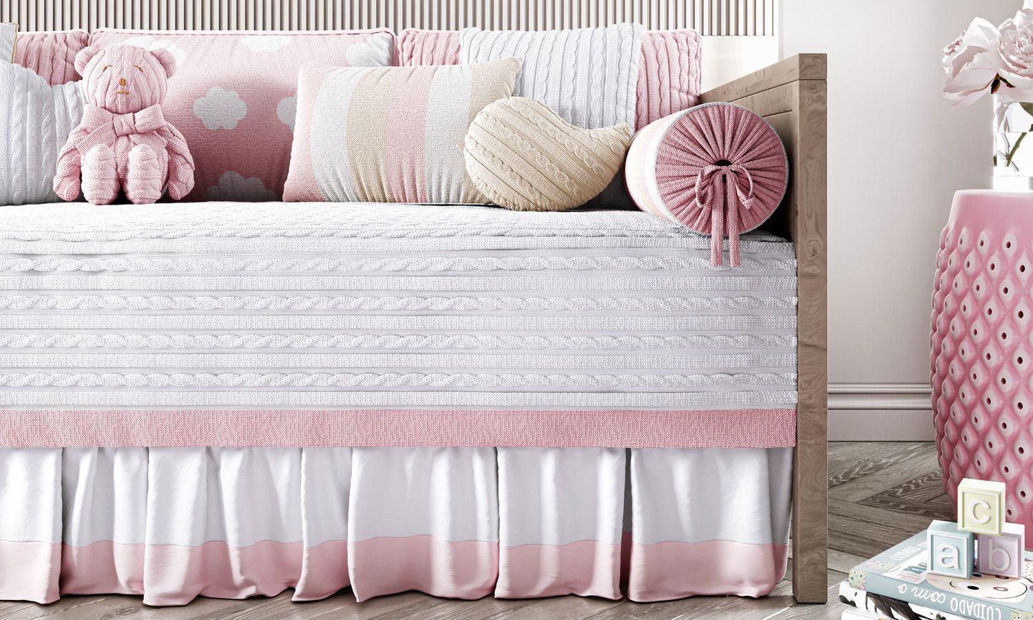 A delicadeza do Kit Cama Babá Tricot Nuvem Rosa vai deixar o quarto do seu bebê ainda mais charmoso! Com cores suaves que transmitem tranquilidade e leveza, o enxoval para cama inclui colcha cobre leito em tricô, dois rolinhos protetores laterais com listras e três almofadas para encosto – uma delas com estampa de nuvens. São peças que ajudam a transformar a cama de solteiro ou cama sofá em um sofá convidativo e aconchegante.