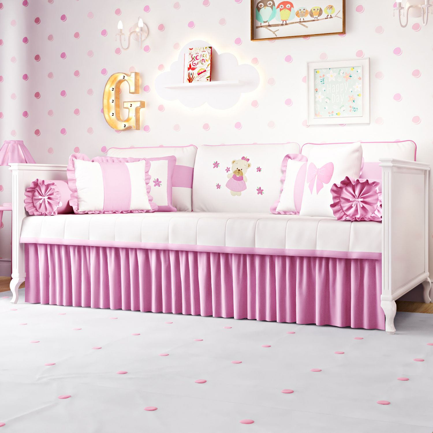 Pensando no conforto das mamães e na decoração do quarto de bebê, criamos o deslumbrante Kit Cama Babá Ursinha Bebê! Esse enxoval transforma a cama de solteiro num sofá impecável e convida a família para se acomodar com conforto. Além do bem-estar, as seis peças garantem beleza no ambiente já que reúnem os itens preferidos das meninas: ursinha, flores e belíssimos tons de rosa. Numa fina confecção, três almofadas de apoio para encosto variam entre o tecido liso com faixa e o incrível bordado da coleção. Elas também acompanham enchimento fofinho e zíper para facilitar a higienização. Dois rolinhos para as laterais - com babados nas extremidades - e um edredom completam o time com o charme dessa coleção. Os acessórios são adequados para as diversas fases da neném e úteis quando a pequena estiver grande o suficiente para transição do berço para a cama. Confira as Almofadas Decorativas Ursinha Bebê e embeleza sua cama babá!