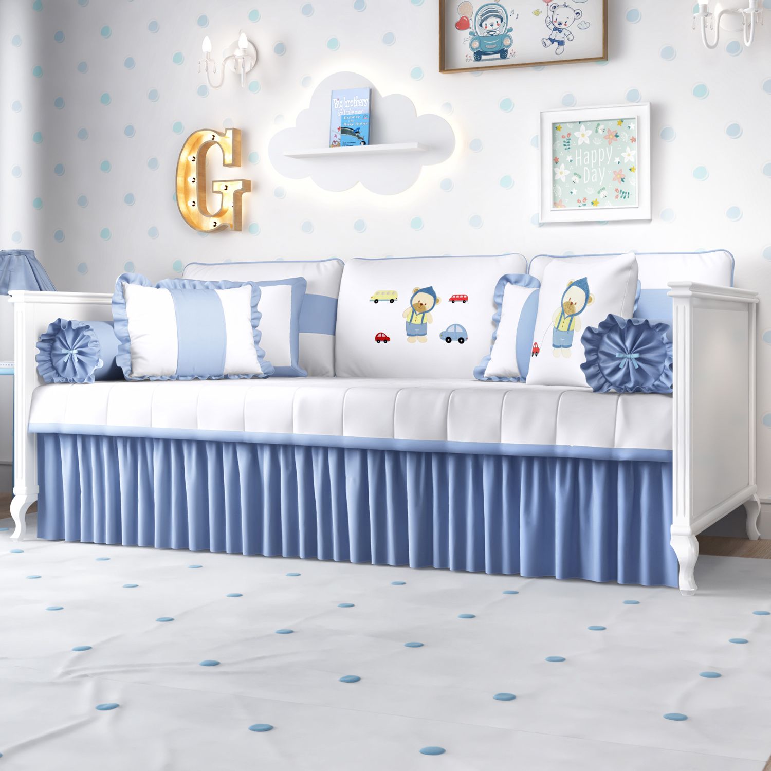 Pensando no conforto das mamães e na decoração do quarto de bebê, criamos o lindo Kit Cama Babá Ursinho Bebê! Esse enxoval transforma a cama de solteiro num sofá impecável e convida família ou visitas para se acomodar com conforto. Além do bem-estar, as seis peças garantem beleza no ambiente já que reúnem os itens preferidos dos meninos: ursinho, carrinhos e o suave tom de azul. Numa fina confecção, três almofadas de apoio para encosto variam entre o tecido liso com faixa e o alegre bordado da coleção.