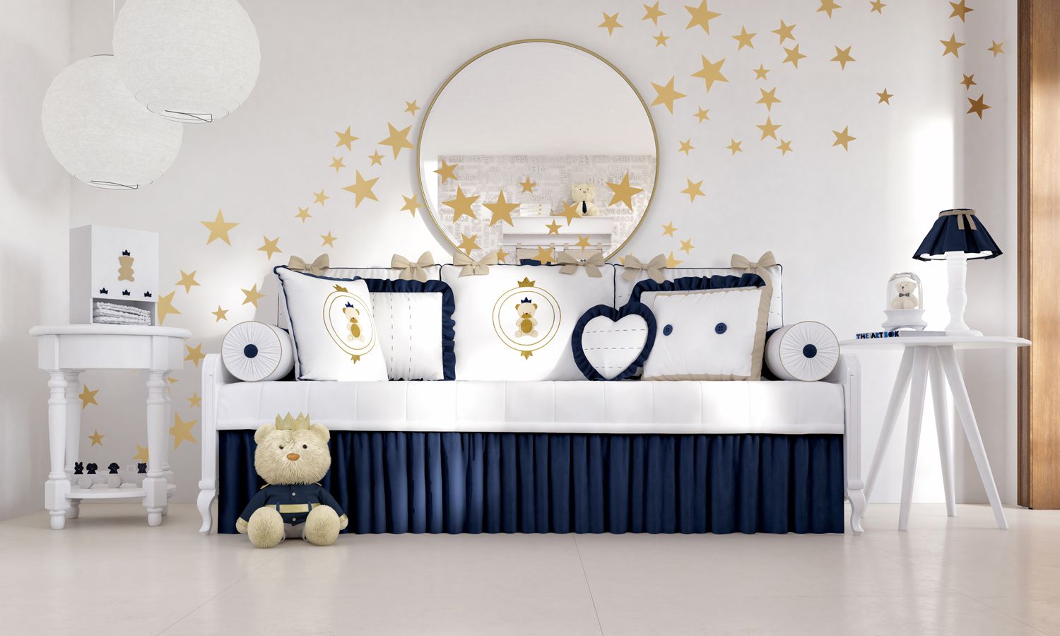 O Kit Cama Babá Urso Teddy Realeza é o que faltava para tornar o sonho do quarto de bebê perfeito em realidade! Impecáveis, as seis peças completam a decoração do cantinho e transformam a cama de solteiro num sofisticado sofá, que convida para cochilar e descansar. O edredom cobre leito, com babado frontal, aquece no mais rigoroso inverno e serve de base para cinco lindas almofadas de apoio com zíper, sendo três para encosto e duas laterais com formato de rolinho. Desenhado com amor, o enxoval se destaca nos mais nobres detalhes — laços, babados e o fino bordado de ursinho coroado — posicionados estrategicamente para cativar o coração das mamães de príncipes.